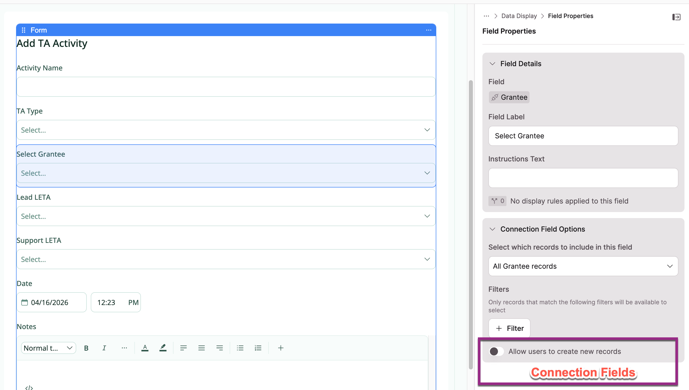 - Under Connection Field Options, toggle on Allow users to create new records