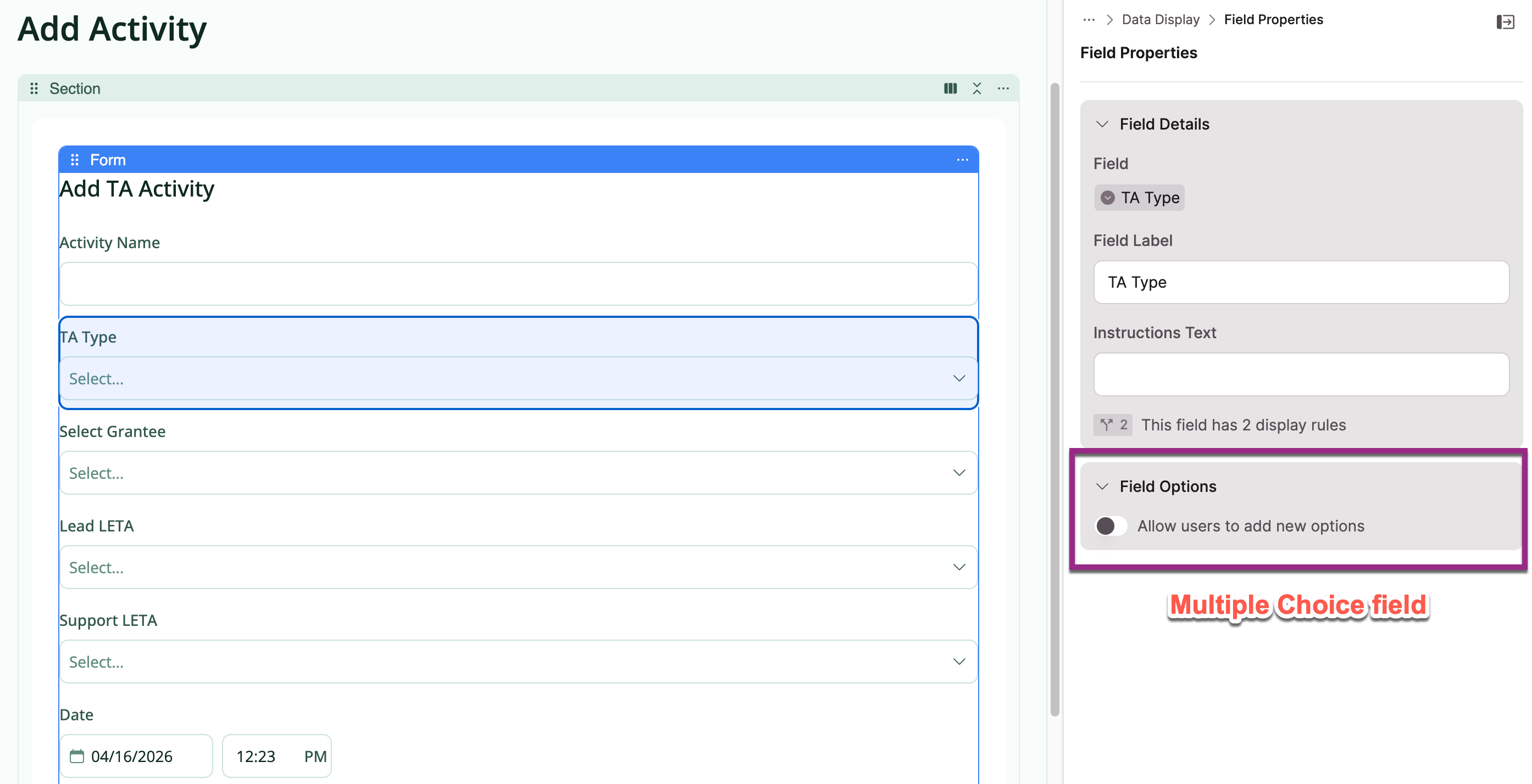 | Multiple Choice | Allow users to add new options | A new choice gets added to the field's list of options. The new option is selected on the current form. |