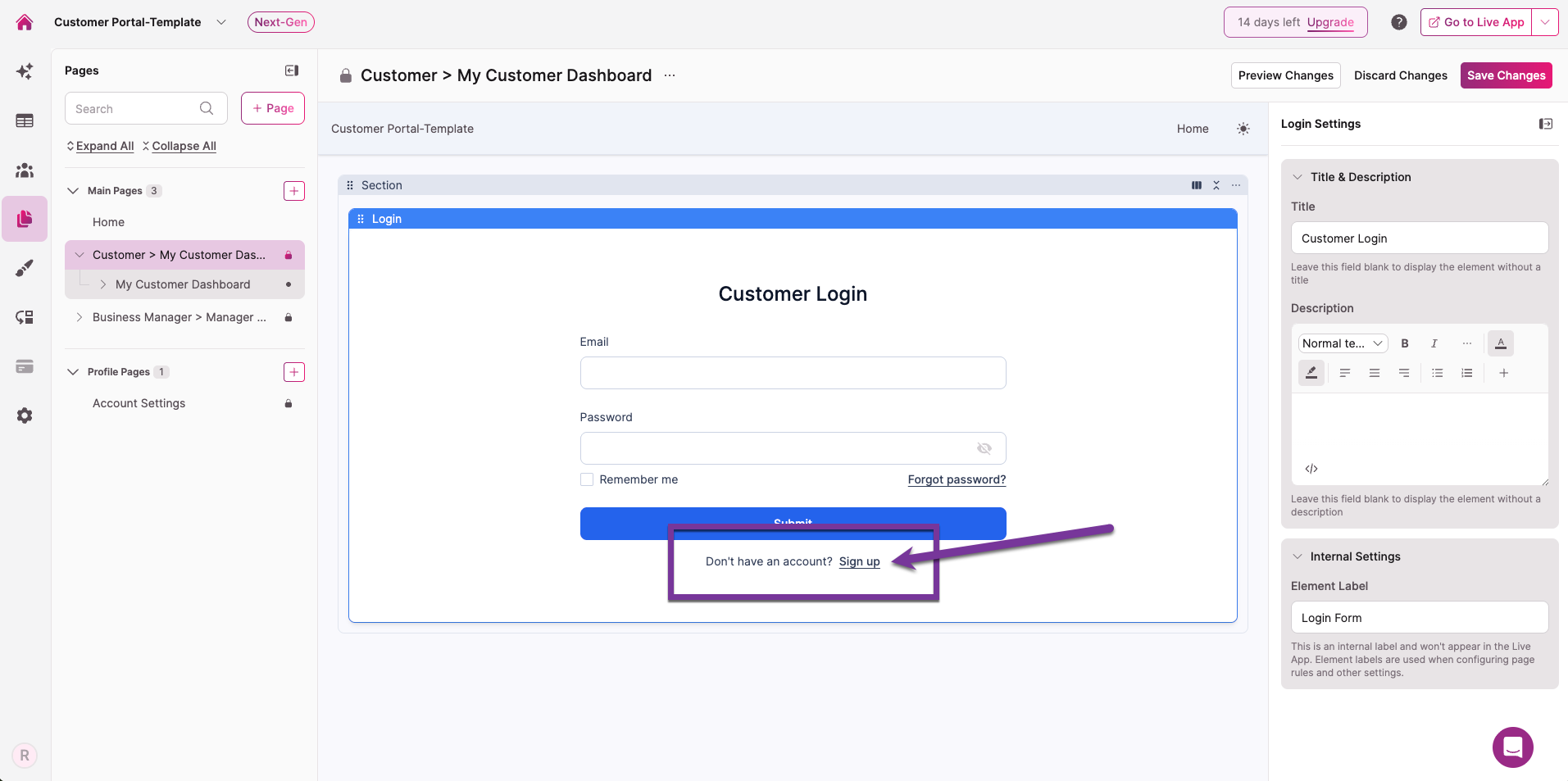 When you enable registration, a "Sign Up" link appears below the login form. This link leads to the registration form, but it won't appear as a child page in the Pages panel on the left-hand side.