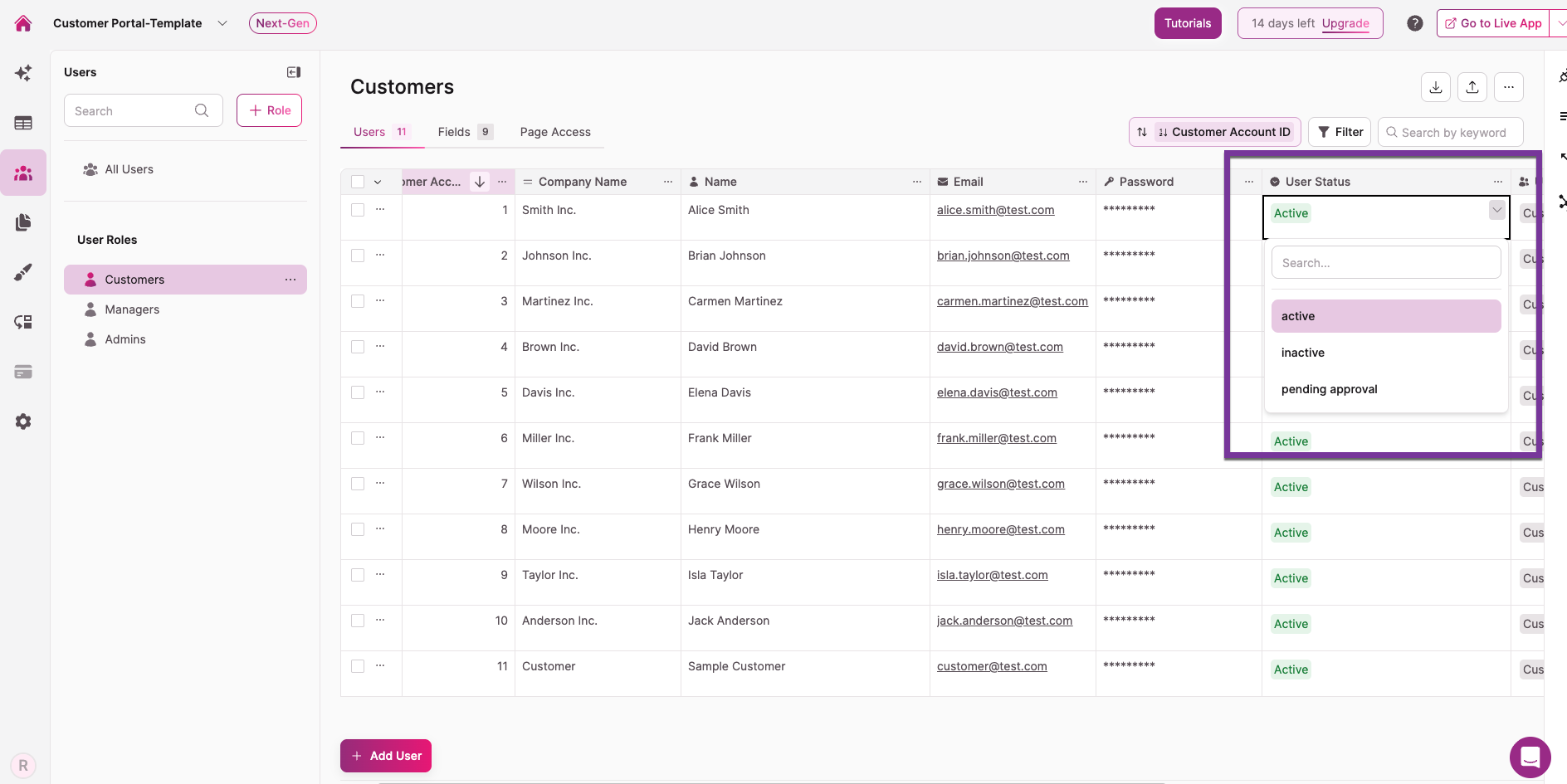 If you'd like to manage approvals from within your live application, you'll need to build pages that allow you to view and update user records. This typically involves adding a page that displays users from your user role table and adding an edit action or enabling inline editing to update the user's status field.