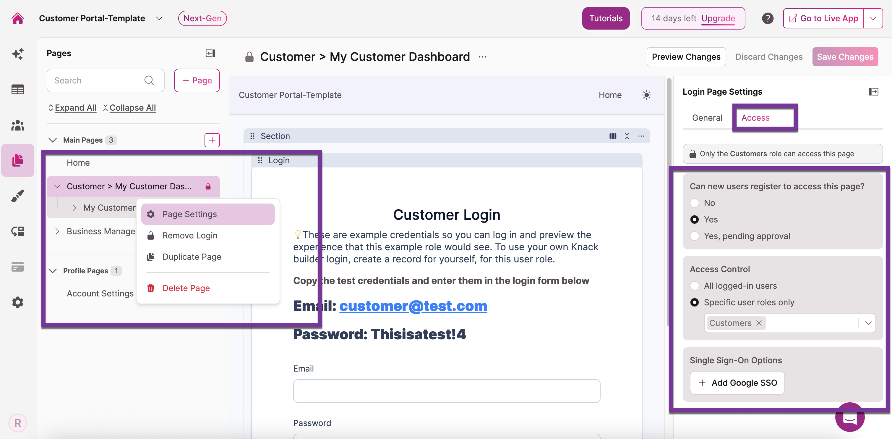 - In the "Which logged-in users can access this page?" section, choose: