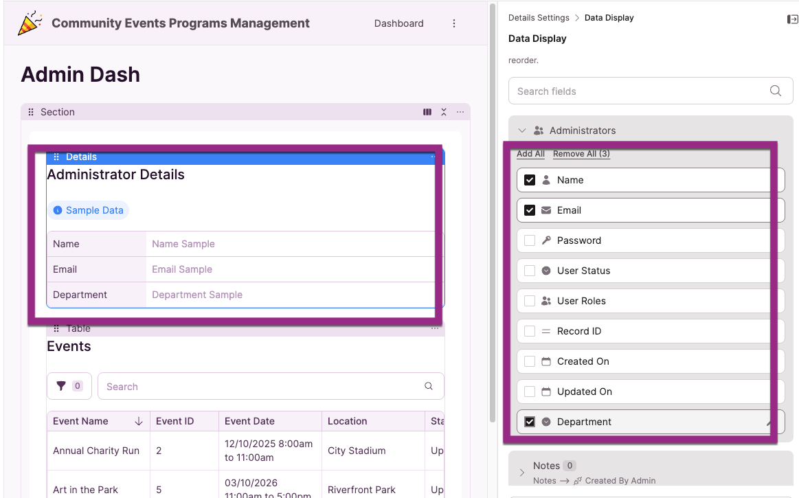 When a user logs in, the Details element automatically pulls their record and displays only their information.