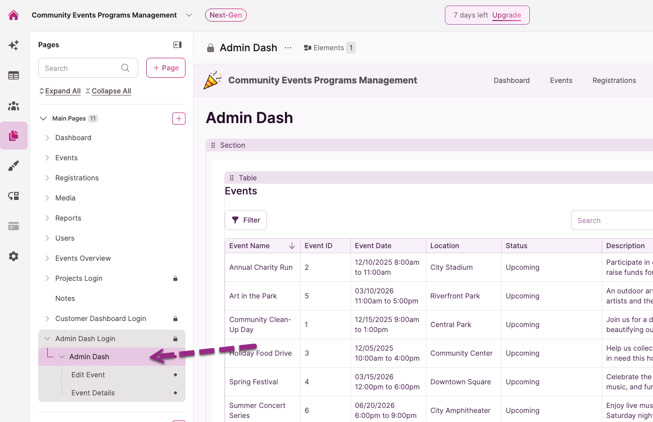 - Open your app in the Builder and navigate to the login-protected page