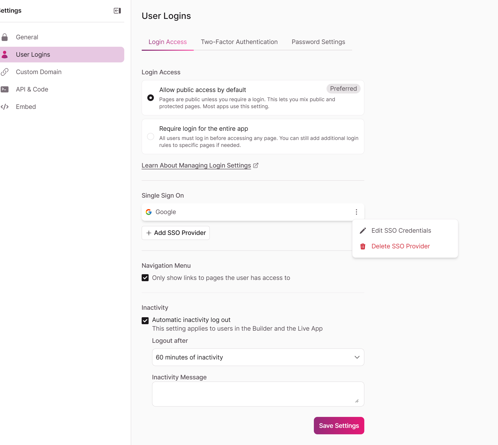 Editing or Deleting SSO Providers must be done via Settings > User Logins > Login Access