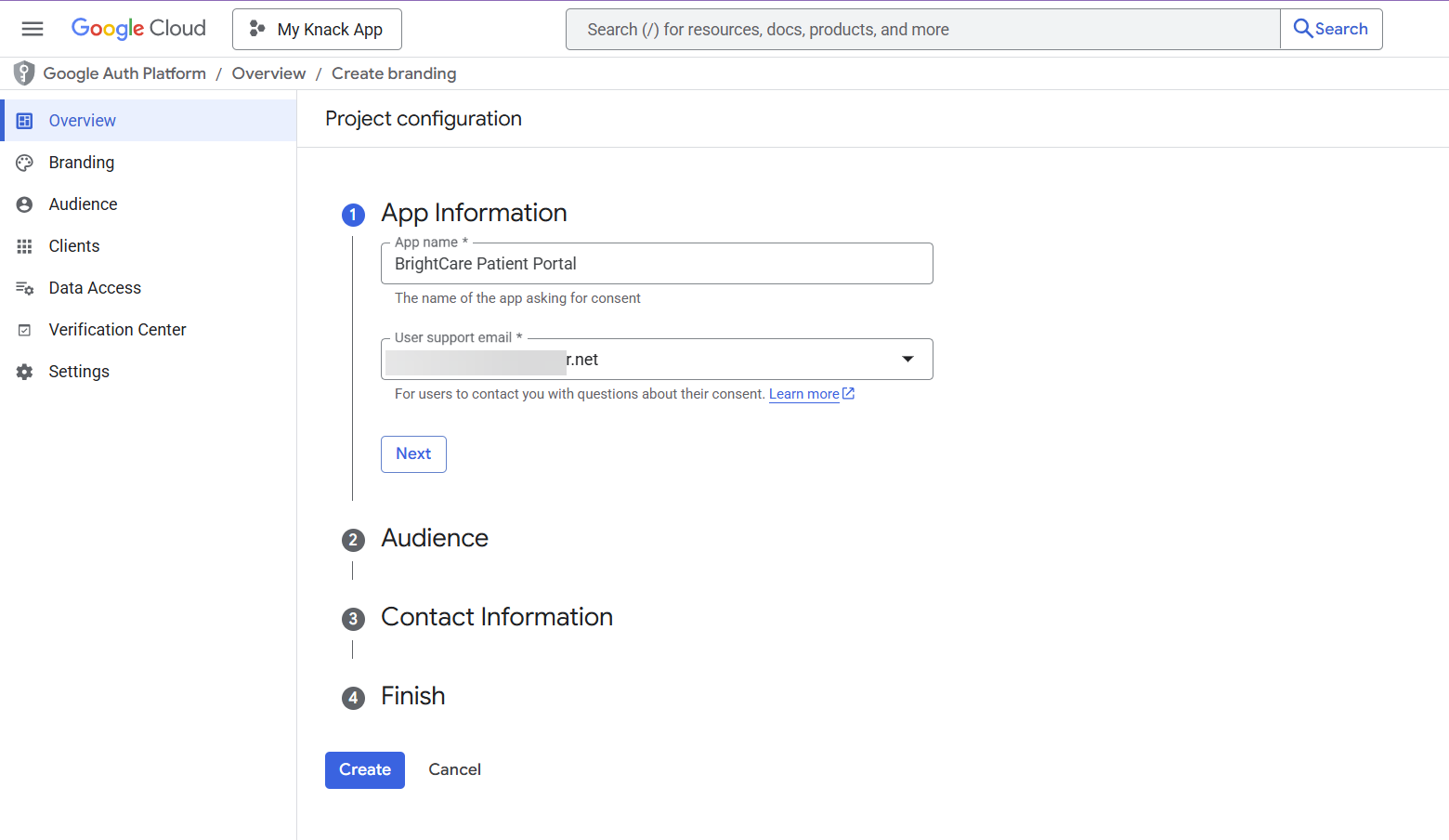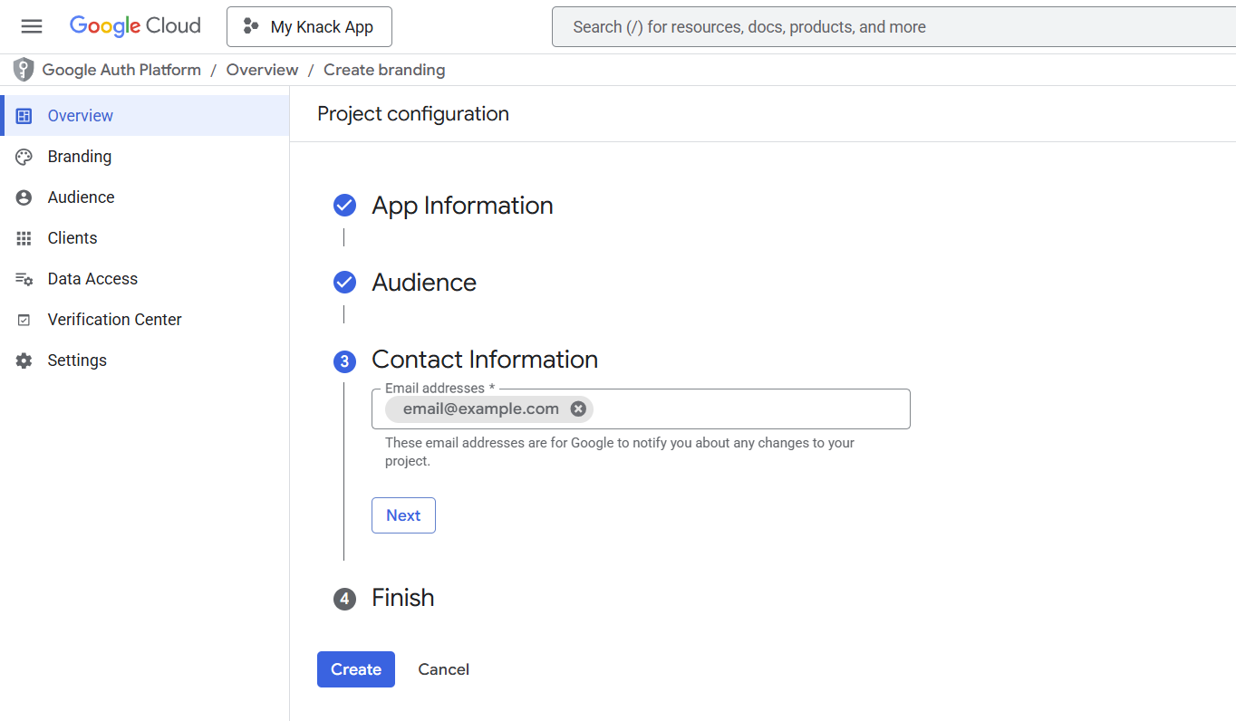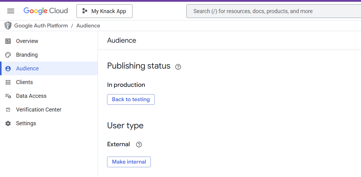 Now you'll create the OAuth 2.0 client that Knack will use to communicate with Google.