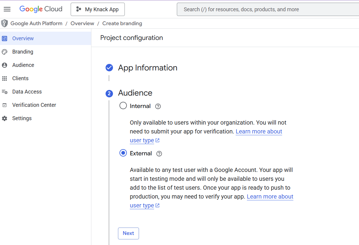 Important: You must select External, not Internal. Selecting Internal restricts authentication to only users within your Google Workspace organization. External allows any Google account holder to sign in to your app.