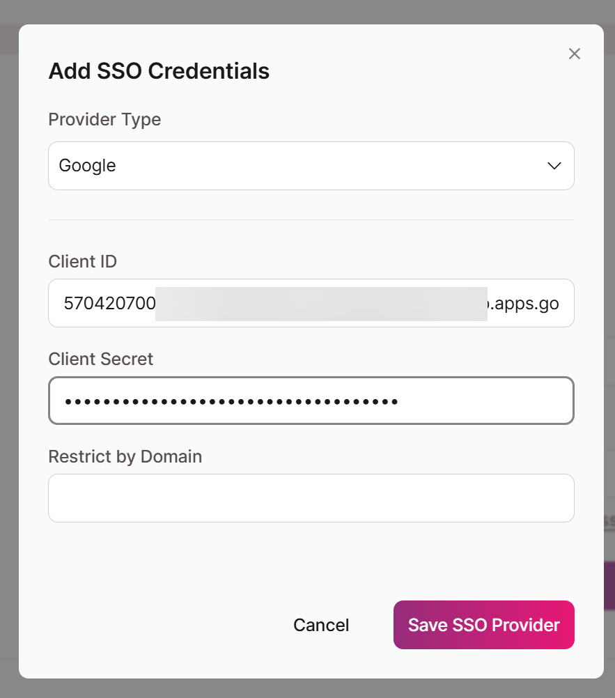 - Domain Restriction (optional): Enter a domain to restrict which Google accounts can log in (e.g., yourcompany.com)