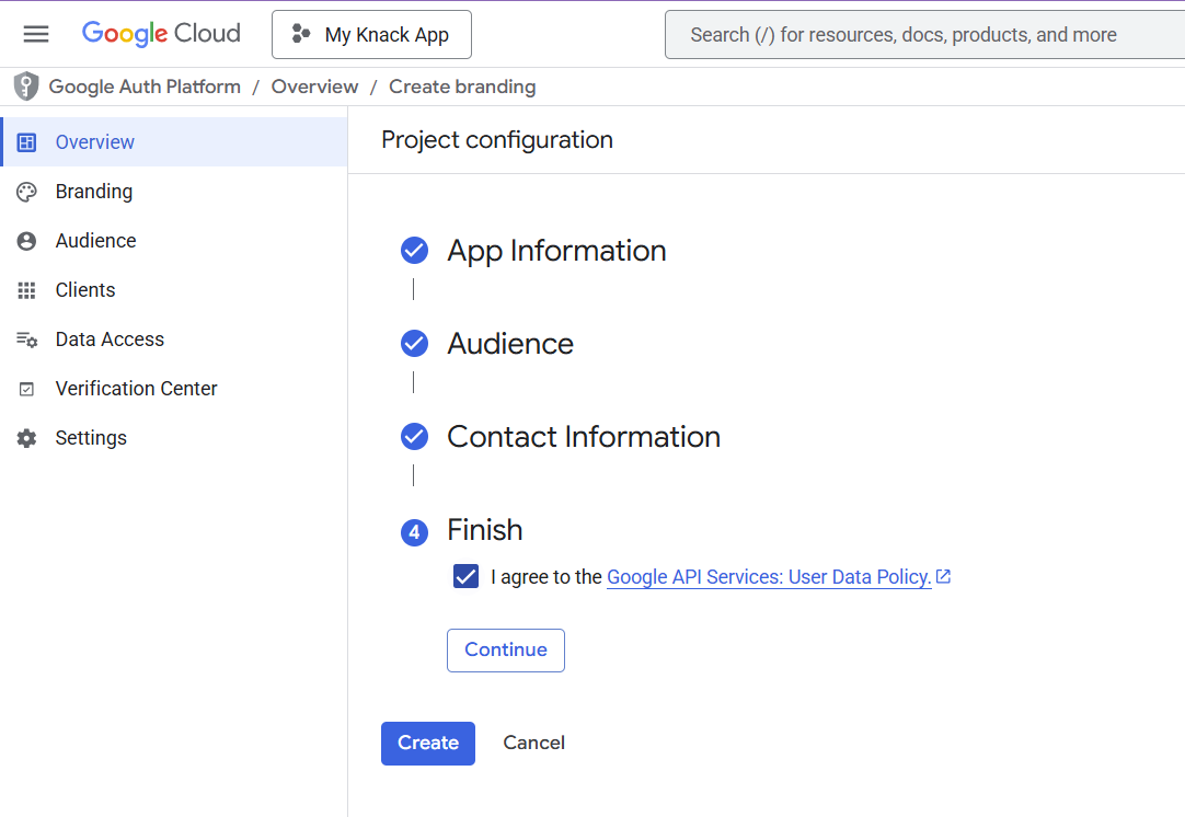 - Check the box to agree to the Google API Services User Data Policy, then click Continue and Create.