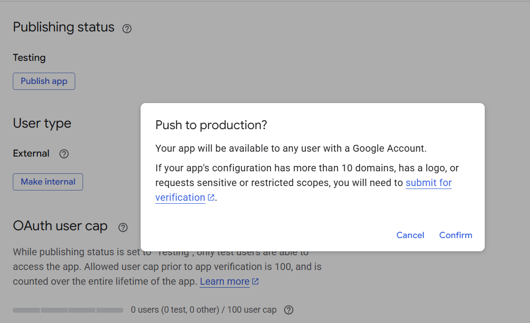 Note: If your app only requests basic scopes (email and profile), Google typically does not require a verification review to publish to production.