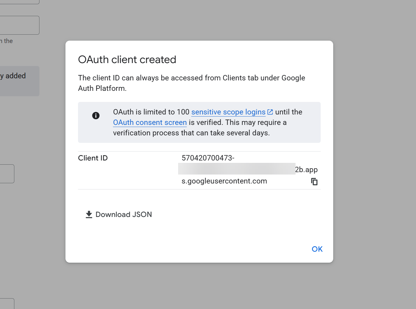 Google will display your Client ID . Copy the value and optionally download the JSON.