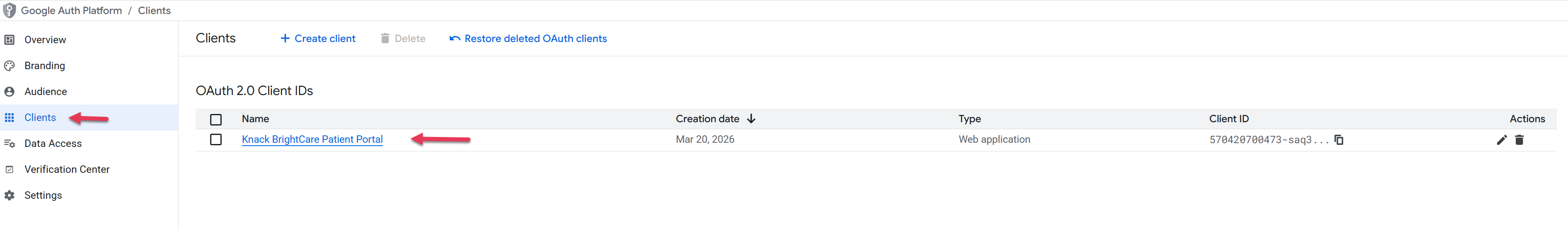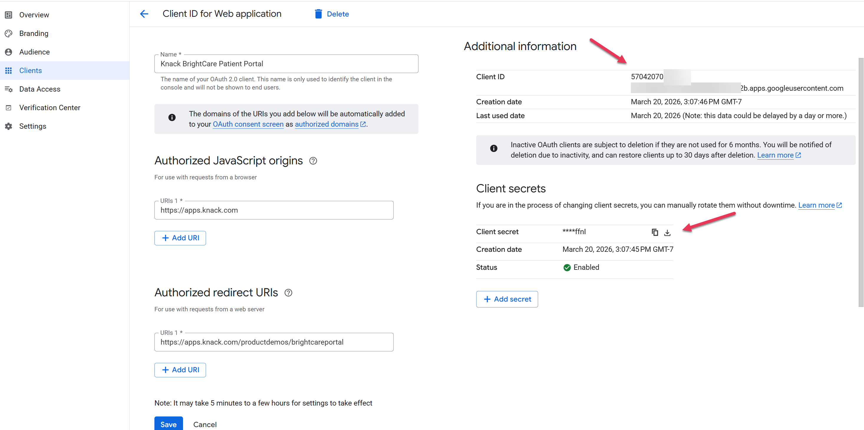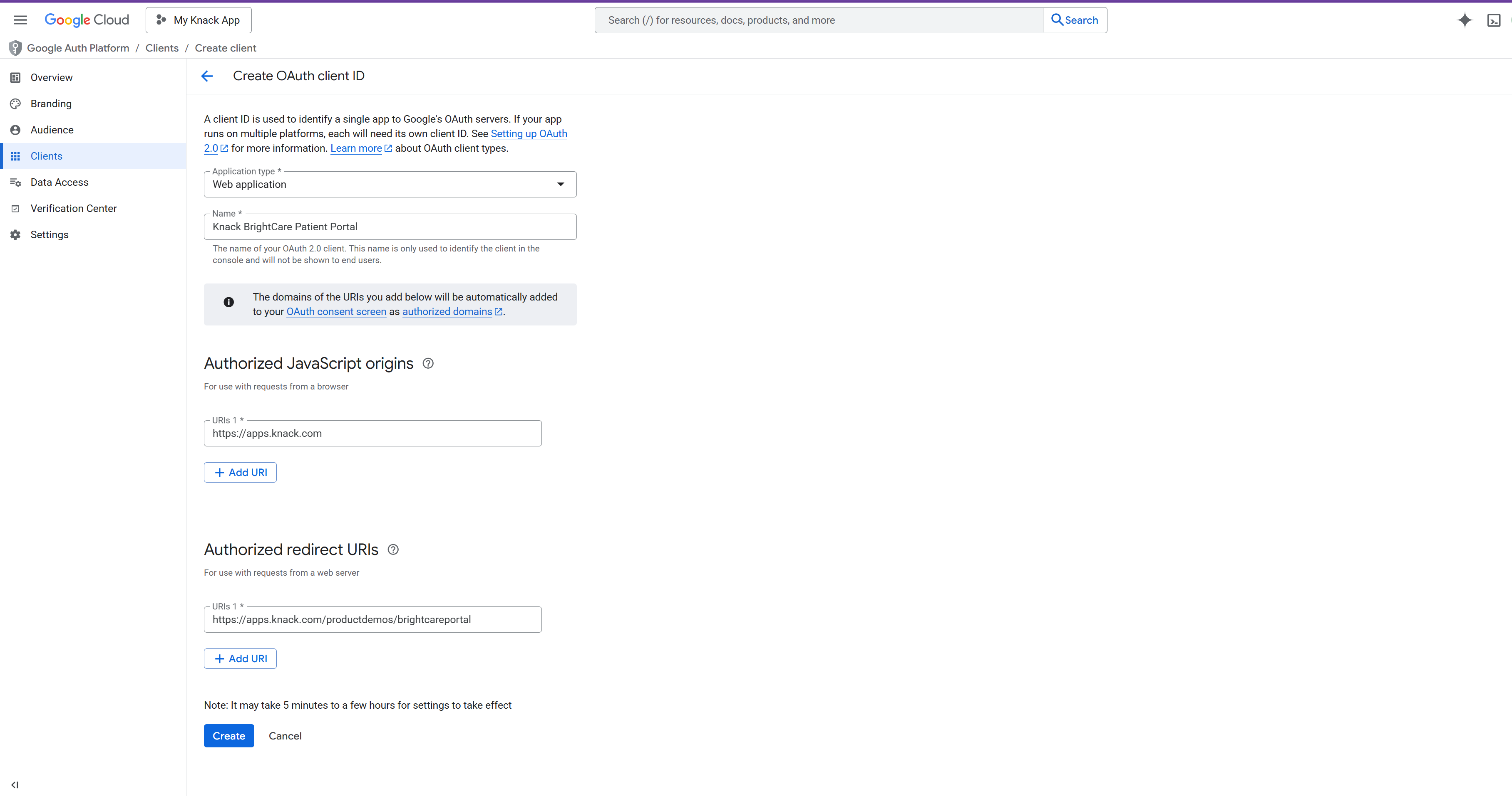 If your Knack app uses a custom domain, you only need one OAuth client. Add your custom domain as the JavaScript origin and your full app URL as the redirect URI. You do not need to create a separate OAuth client for each page or login path — a single client with the correct domain-level origin and redirect URI covers all login and registration pages.