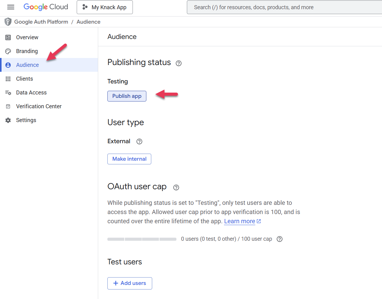 - In Google Cloud Console, navigate to APIs & Services > OAuth consent screen.