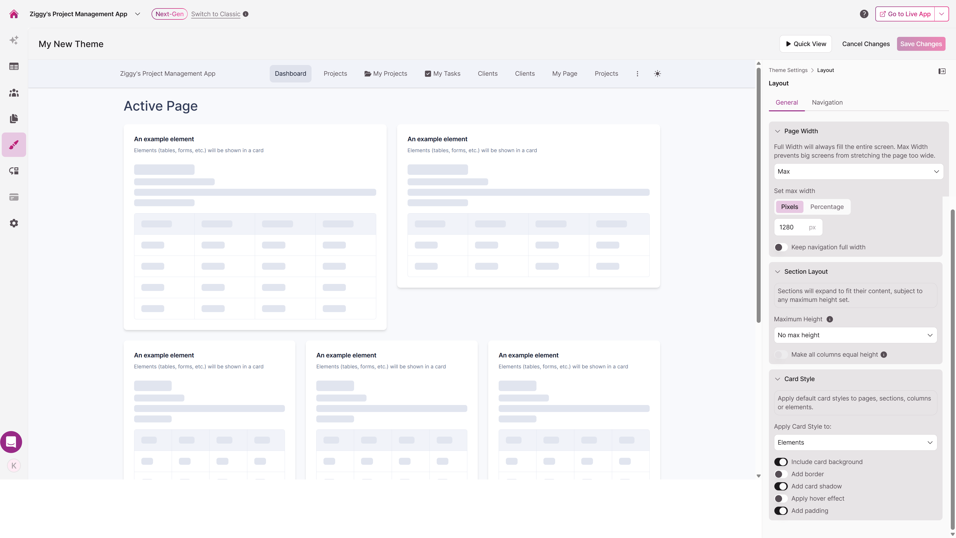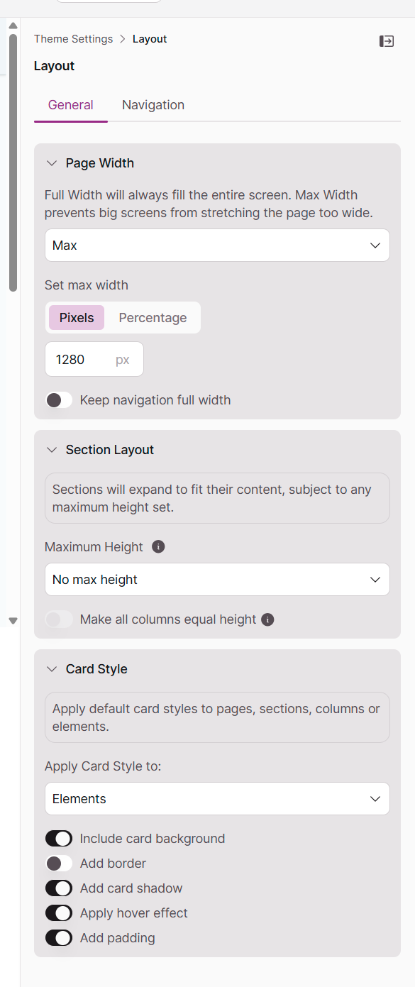 Ready to shape how your app is structured? From the main Theme Builder interface, click the Layout section in the right-hand settings panel. You'll find Layout settings organized into two tabs: General and Navigation.