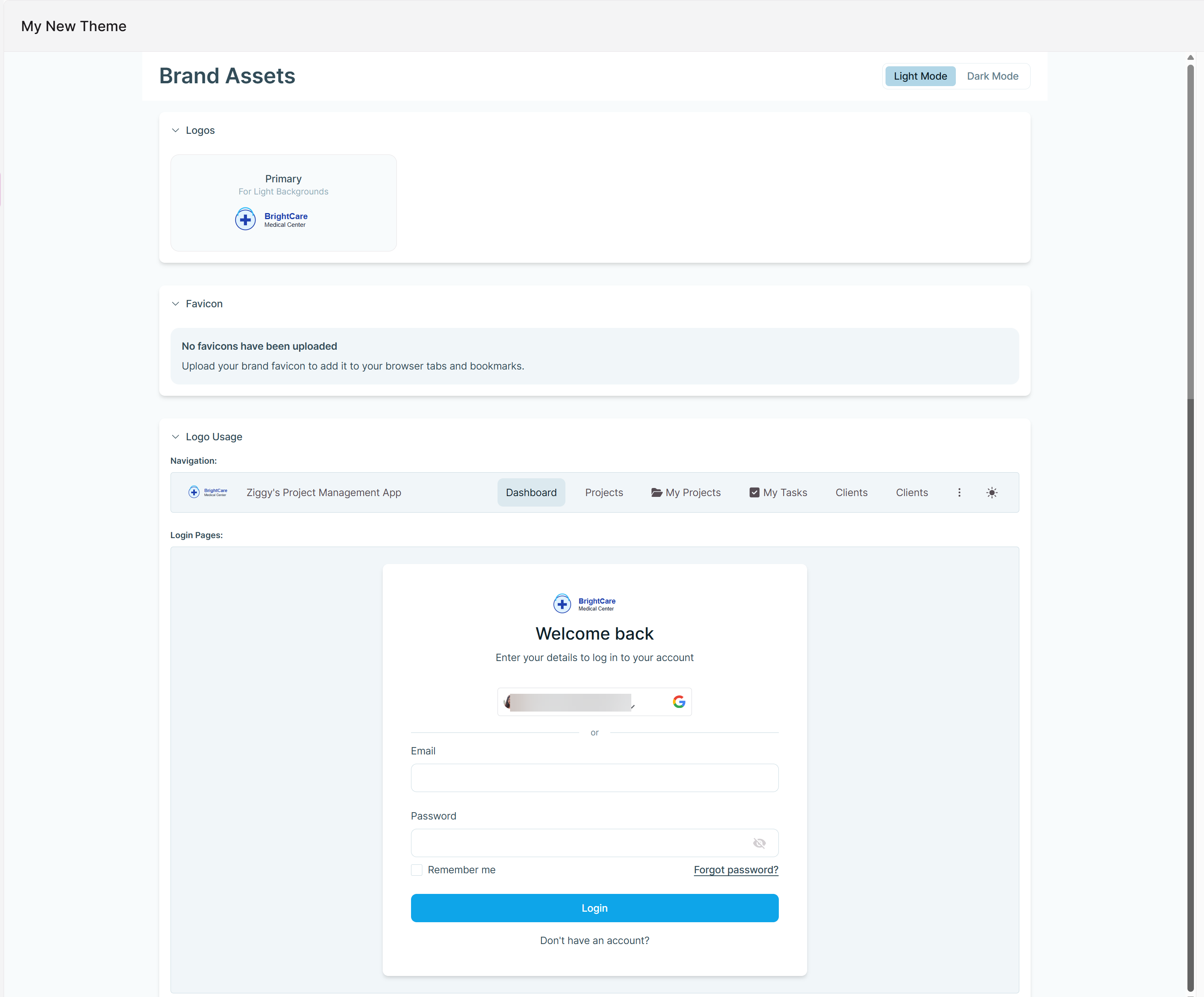 Test in All Modes After uploading your assets, use the Theme Preview panel to check how they appear in both Light and Dark modes. Make sure your logos are always visible, legible, and aligned with your brand standards.