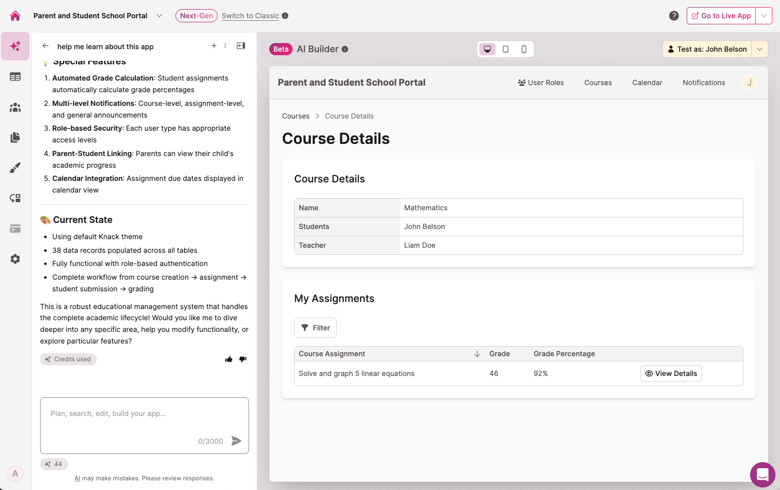Testing as "John Belson", who is in the 'Student' role for this app