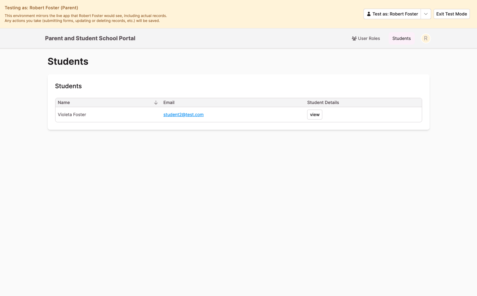 Toggling to "Robert Foster" who is in the 'Parent' role for this app