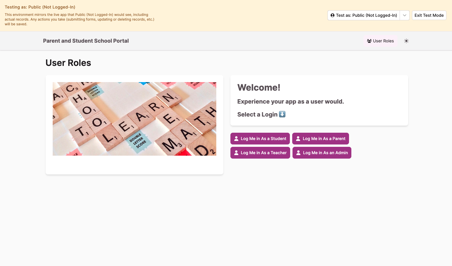 The Public (Not Logged-In) option represents a visitor who has not signed into your app. This allows you to test public pages and forms without creating a dedicated user record.