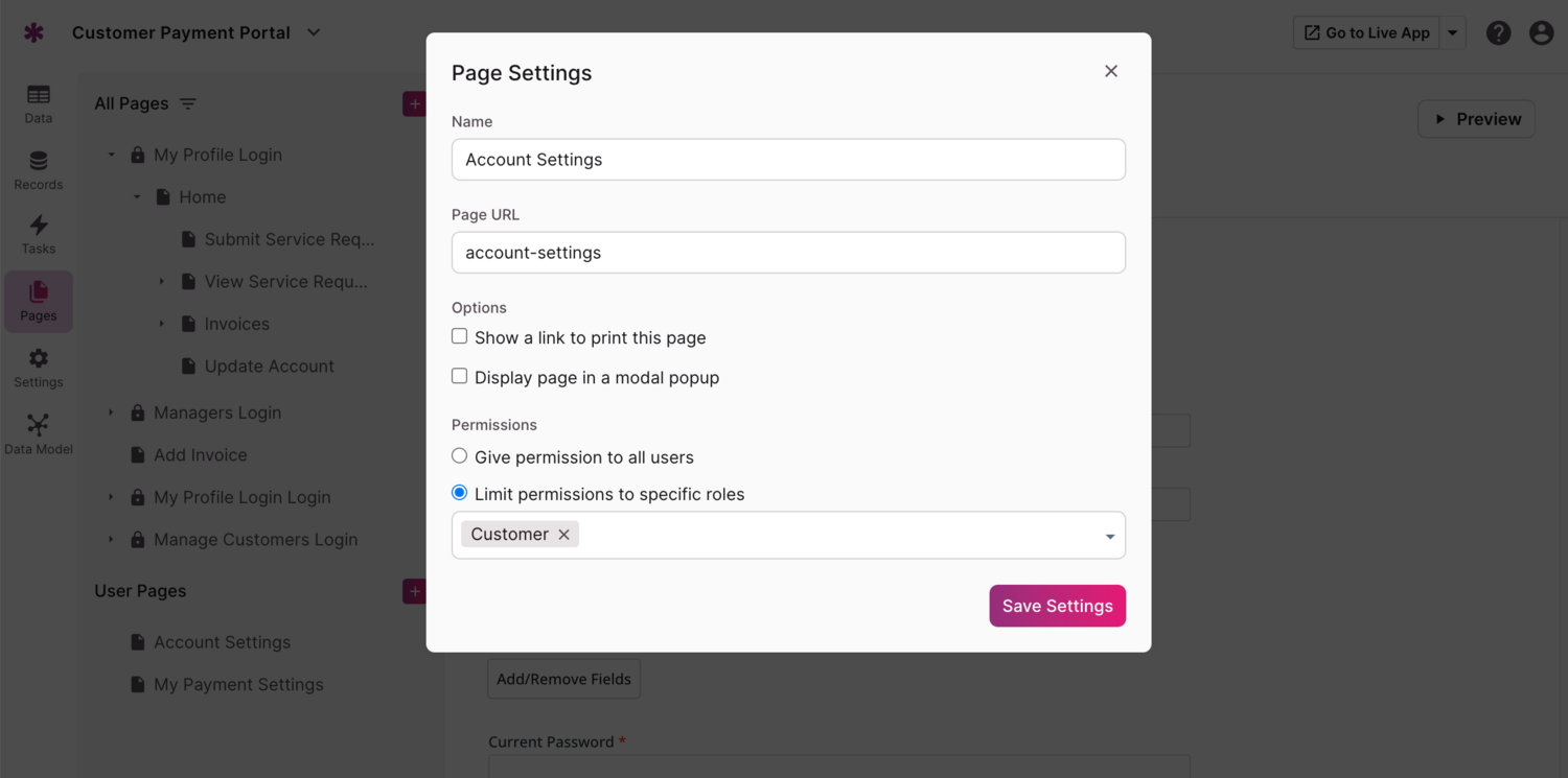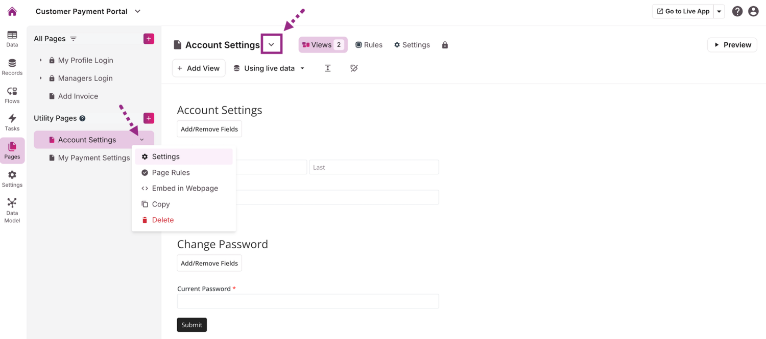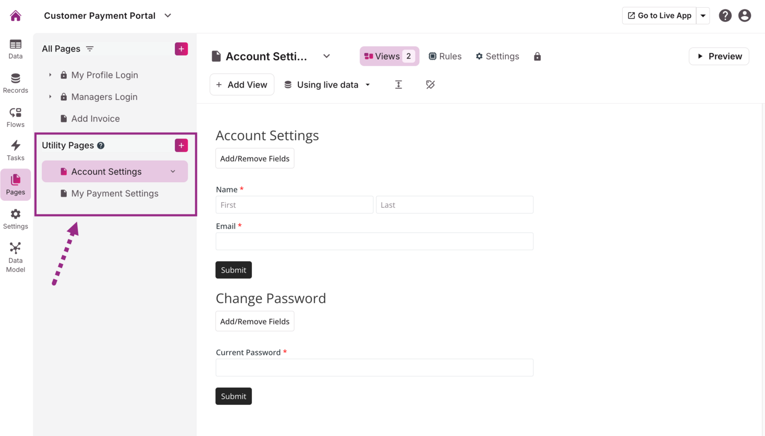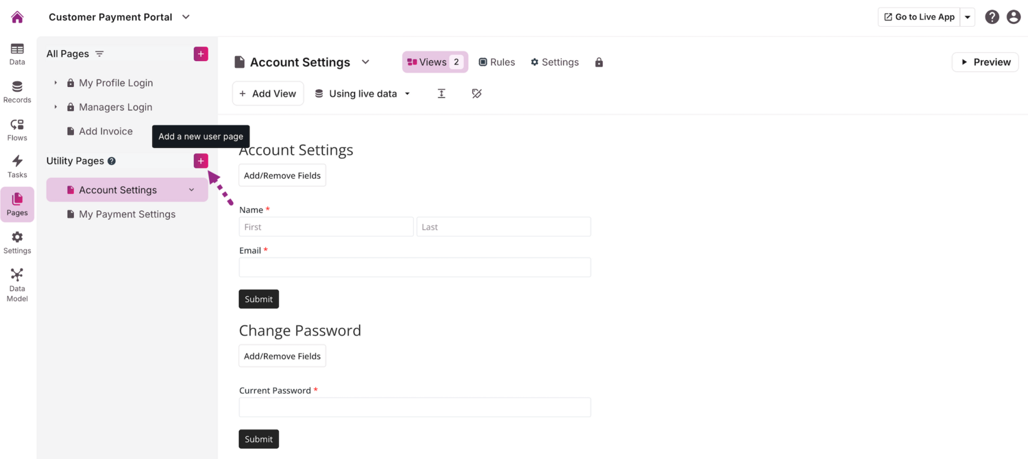 Every utility page you create will automatically be included in the user menu. The user menu is the convenient navigation menu that your users can access from the top-right corner of the Live App.