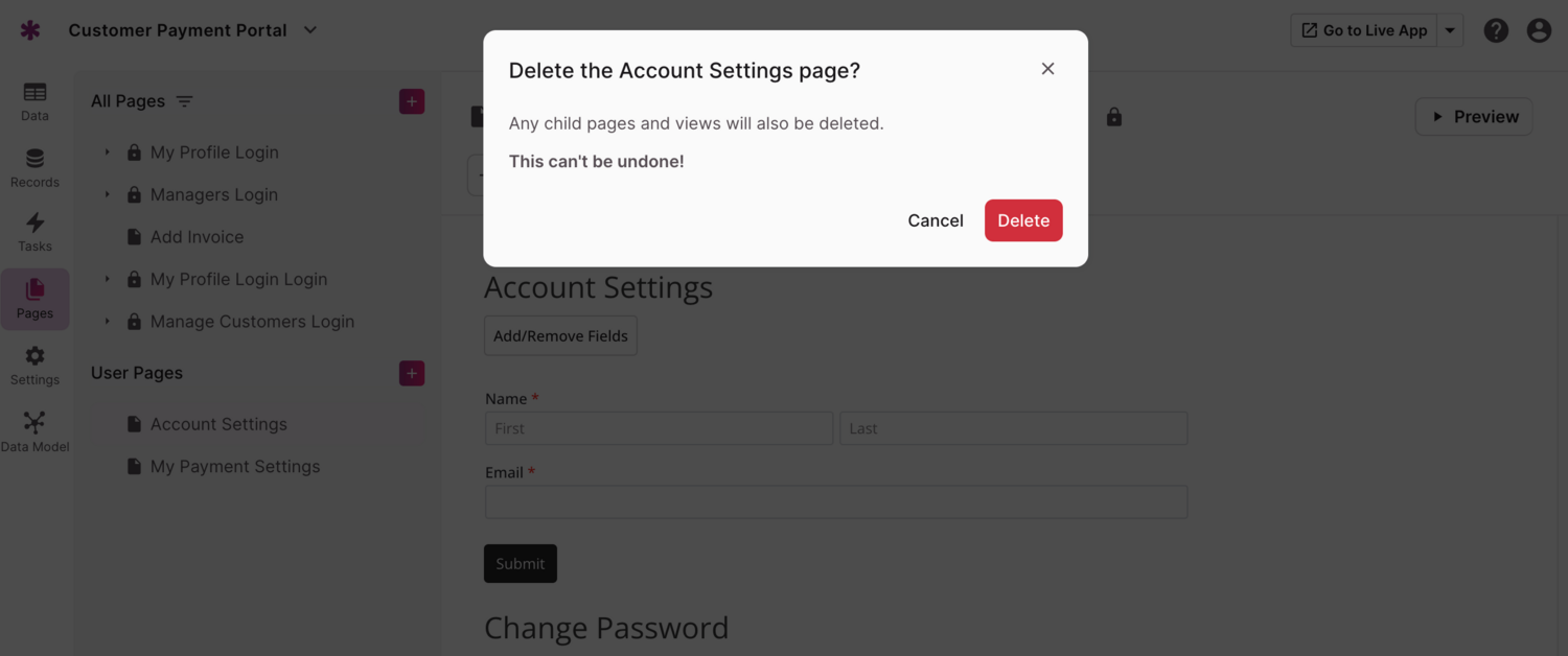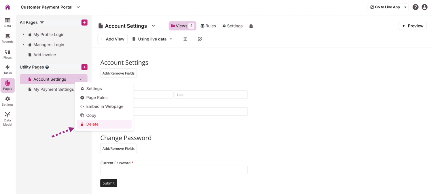 To delete a utility page, simply click on the drop-down arrow icon and choose the "Delete" option. A confirmation prompt will appear asking you to confirm the deletion.