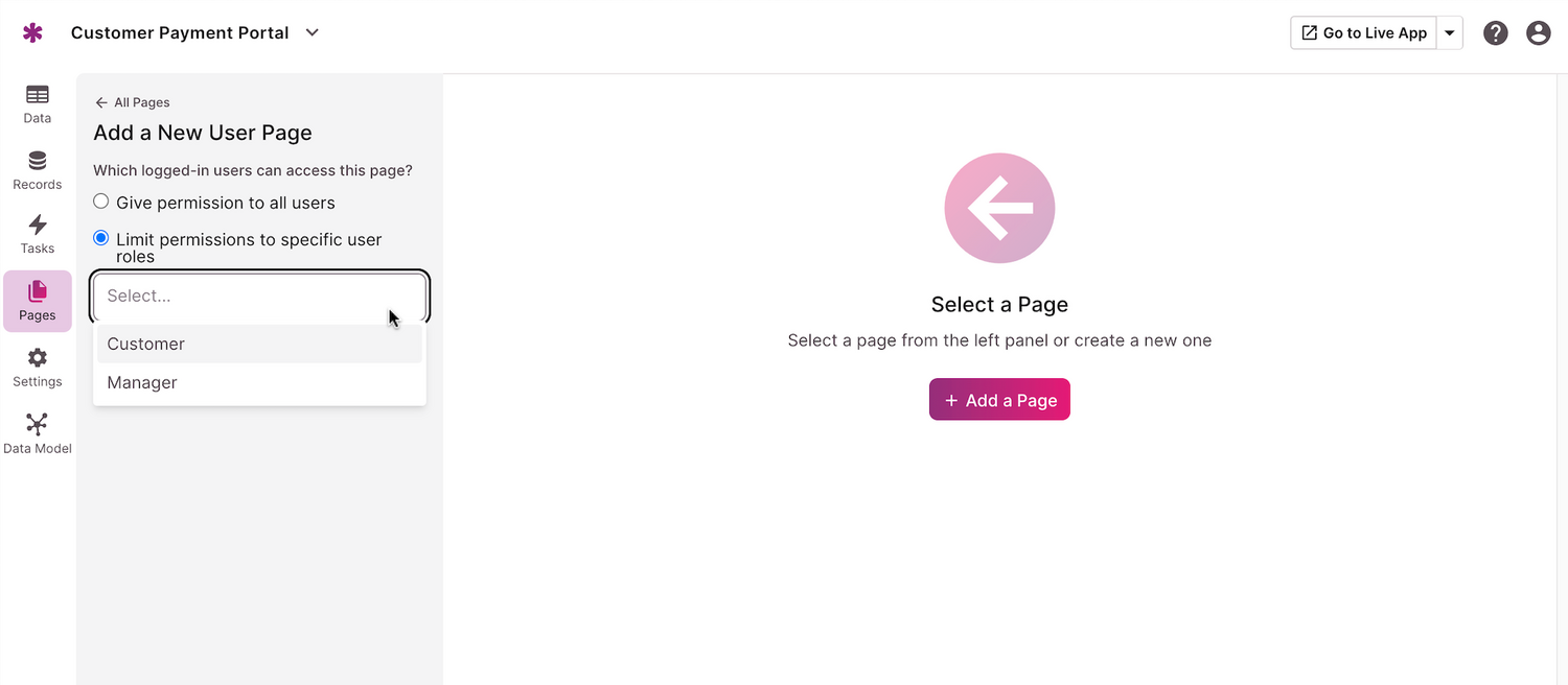 If you choose the "Limit permissions to specific roles" option, you can then select which user roles should have access to the page from the user menu.