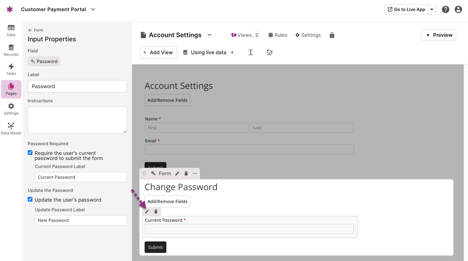 Require the logged-in user's current password: When enabled, this action requires that the user enters their current password in order to submit the form.