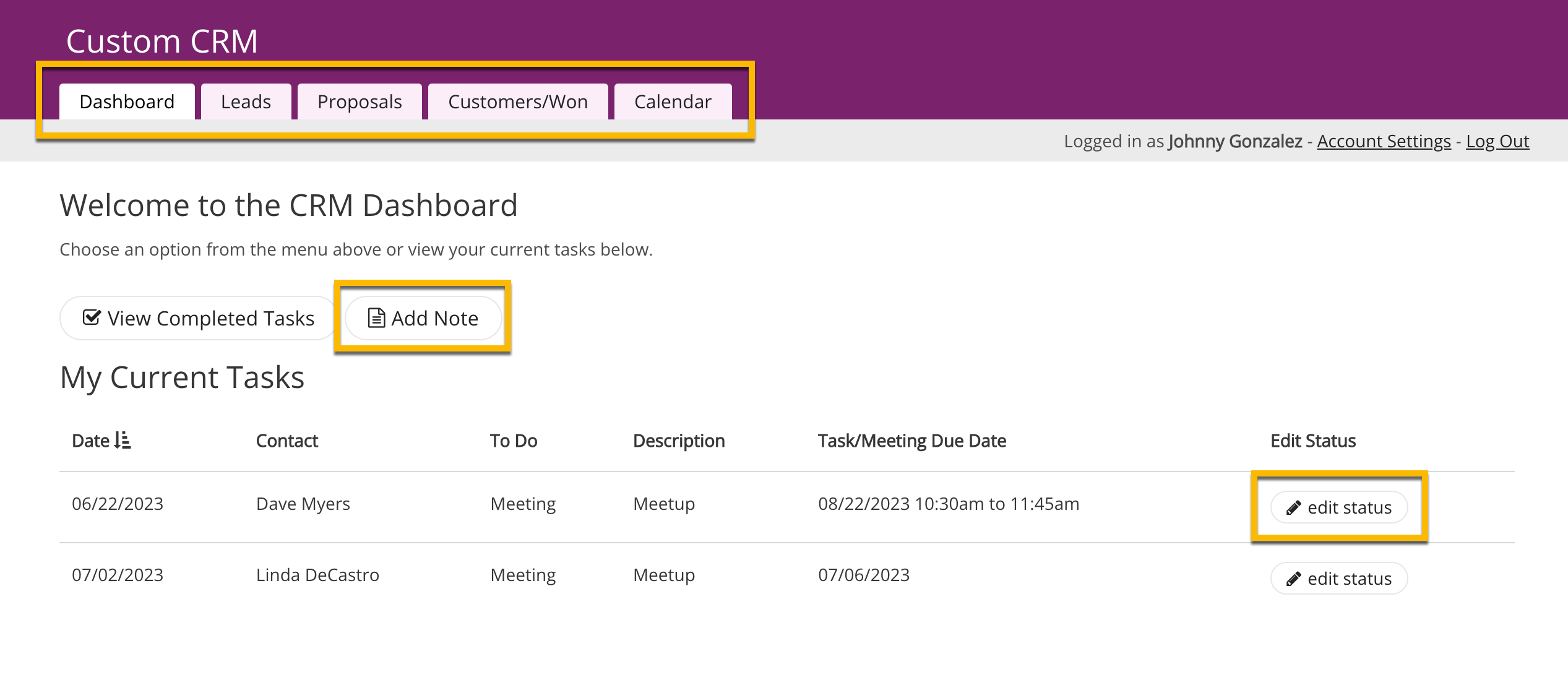 Above the grid, you'll find a convenient link labeled "Add Note." This link represents a menu view that connects to a child page.