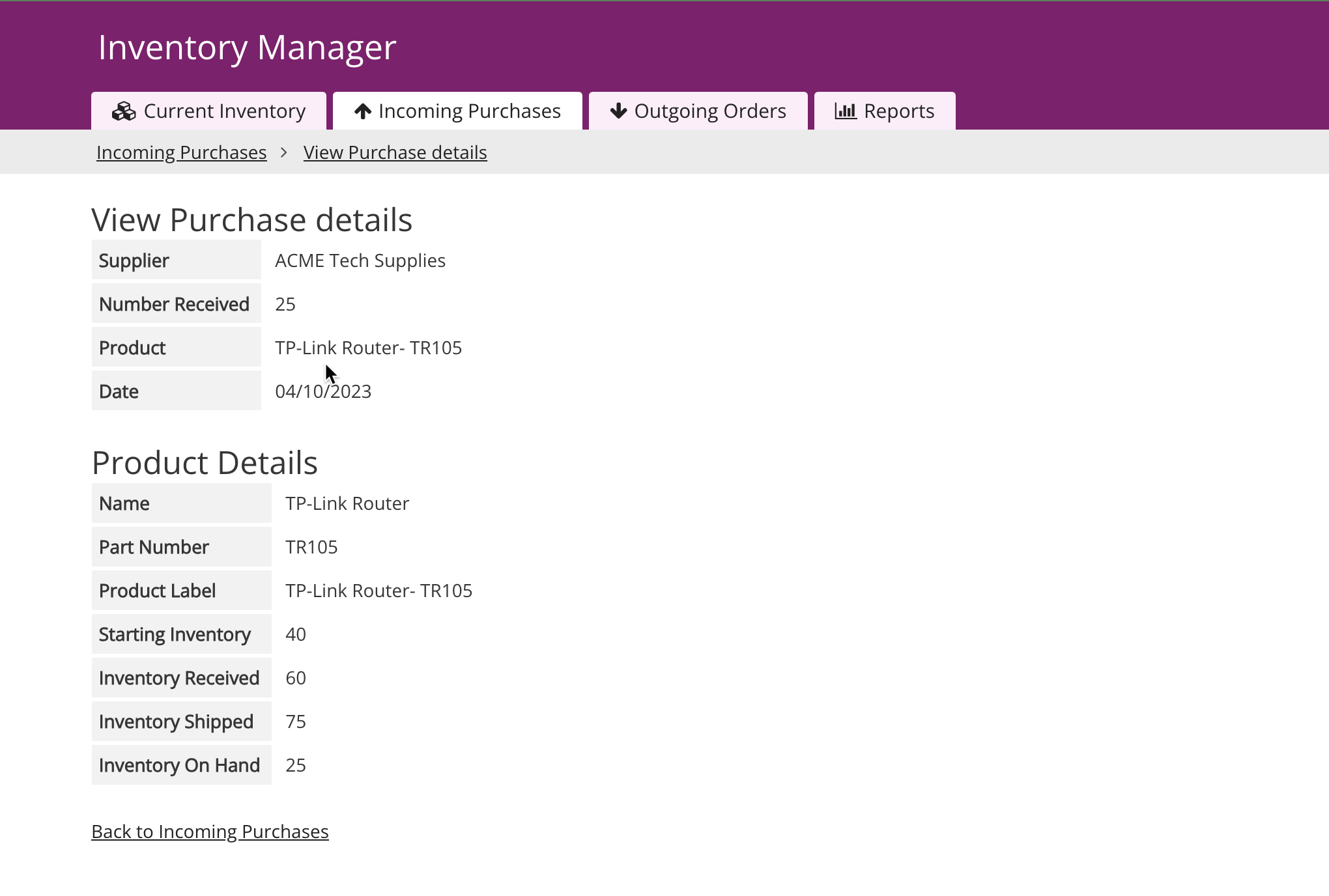 You can easily display the connected records with a view as Knack recognizes the connection between Purchases and Products in the Inventory Manager sample app.