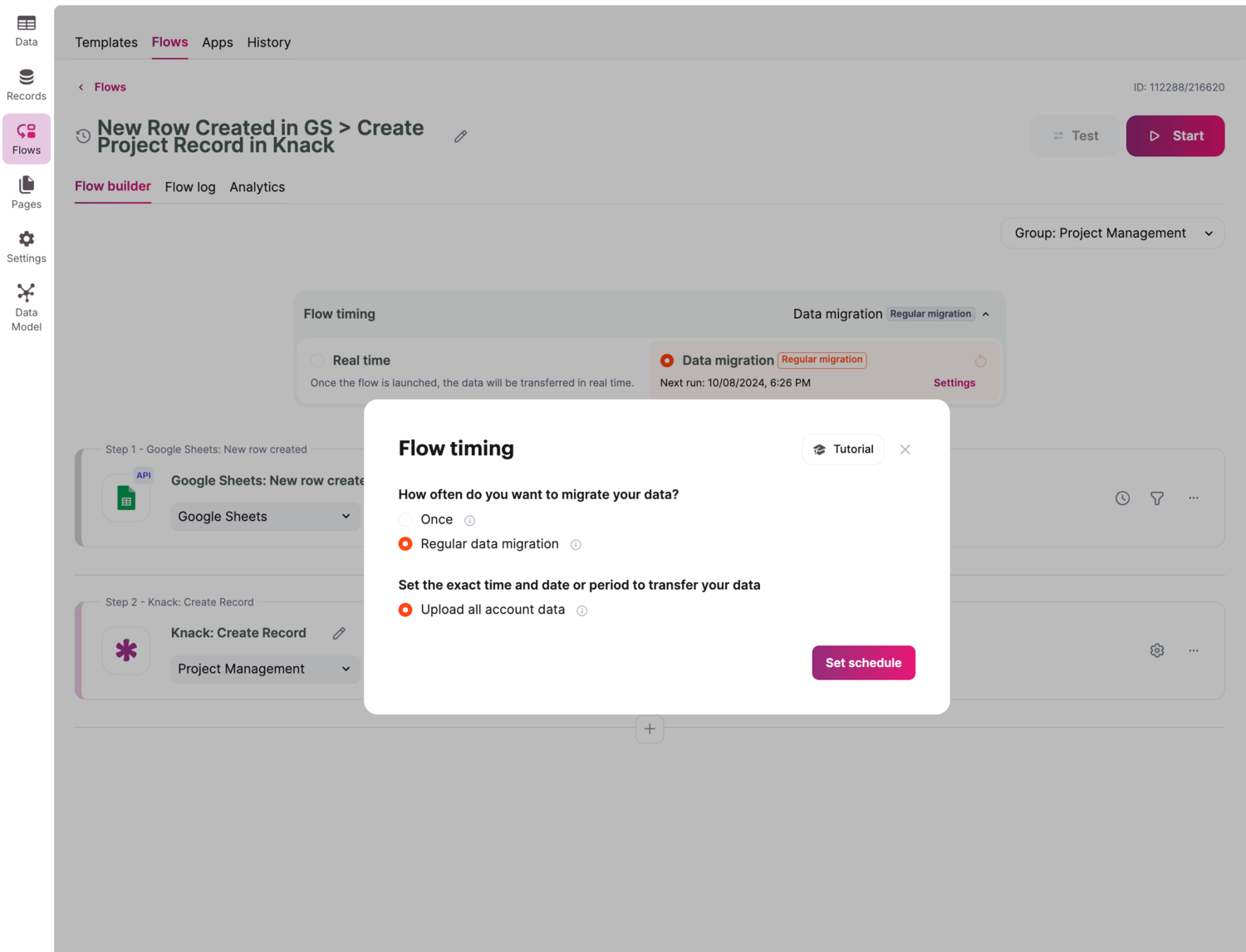Regular data migration: You can define the specific date and time or period from which Flows will initiate the data transfer.