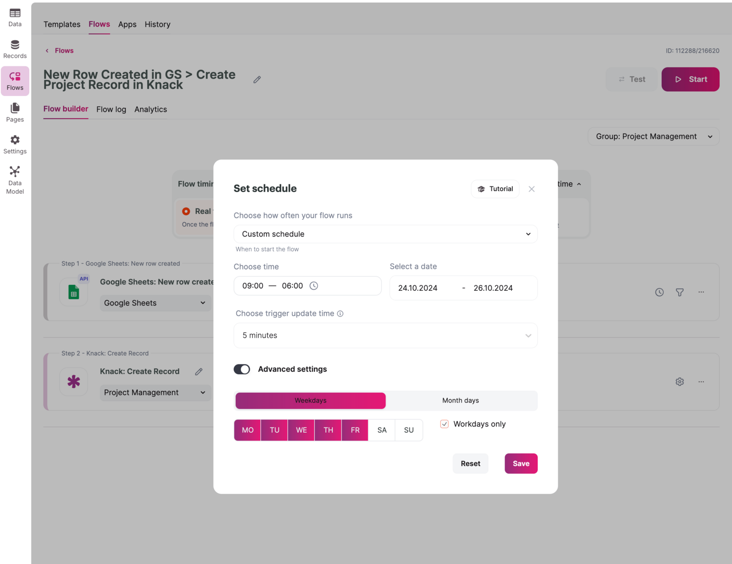 - In this configuration, Flow requests will be dispatched on the selected weekdays, adhering to the defined frequency and time interval.
