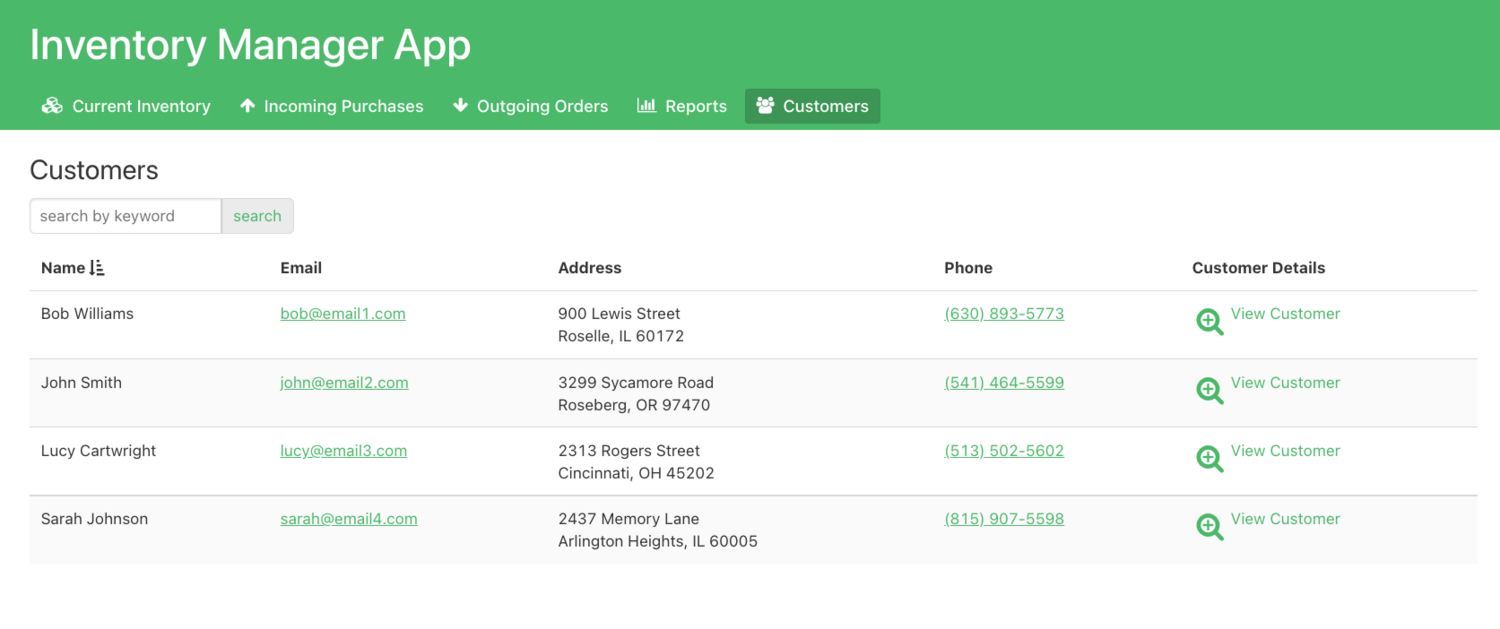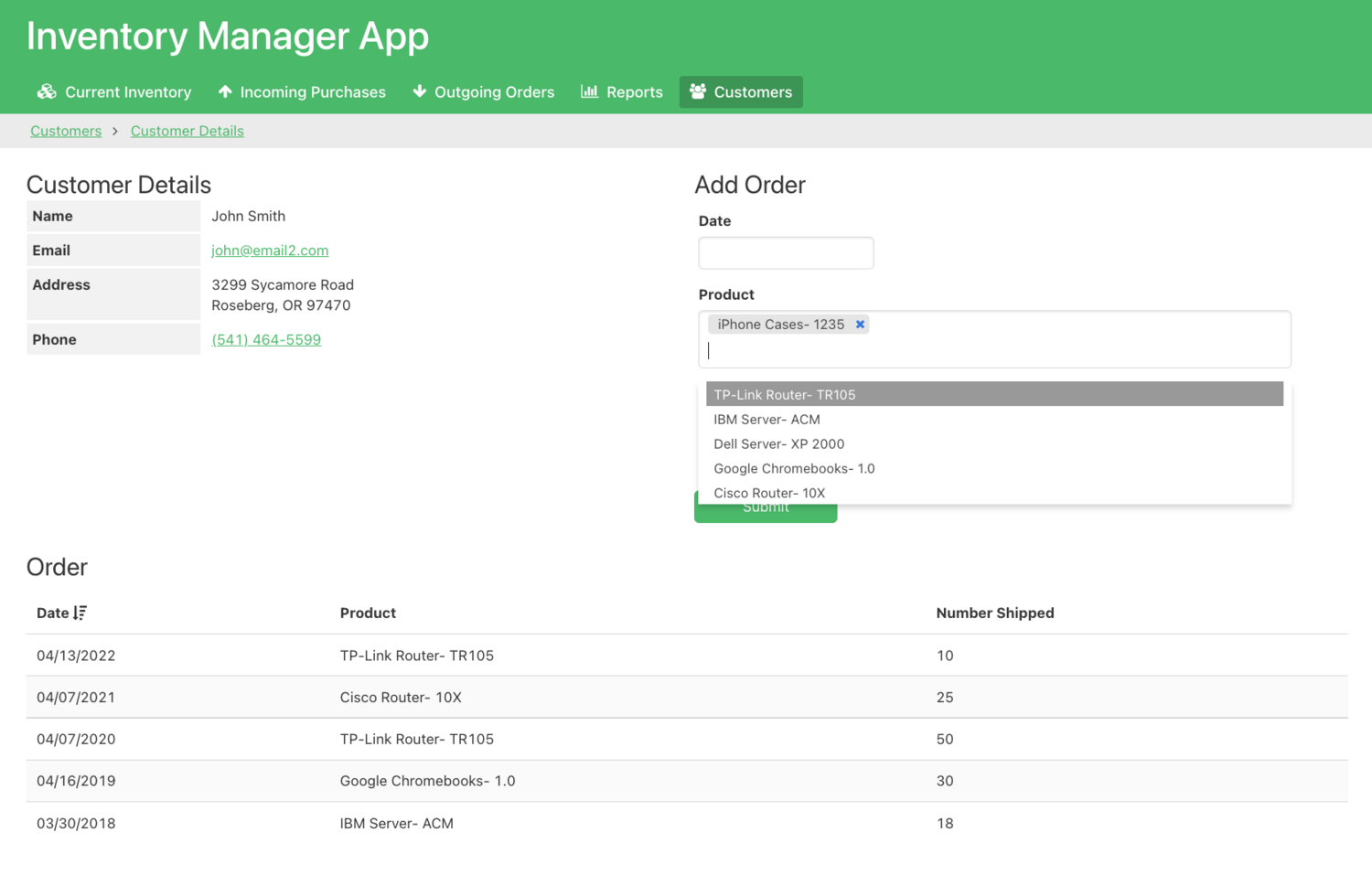 They can click on a specific customer to view the orders that customers made as well as a form to add a new order:
