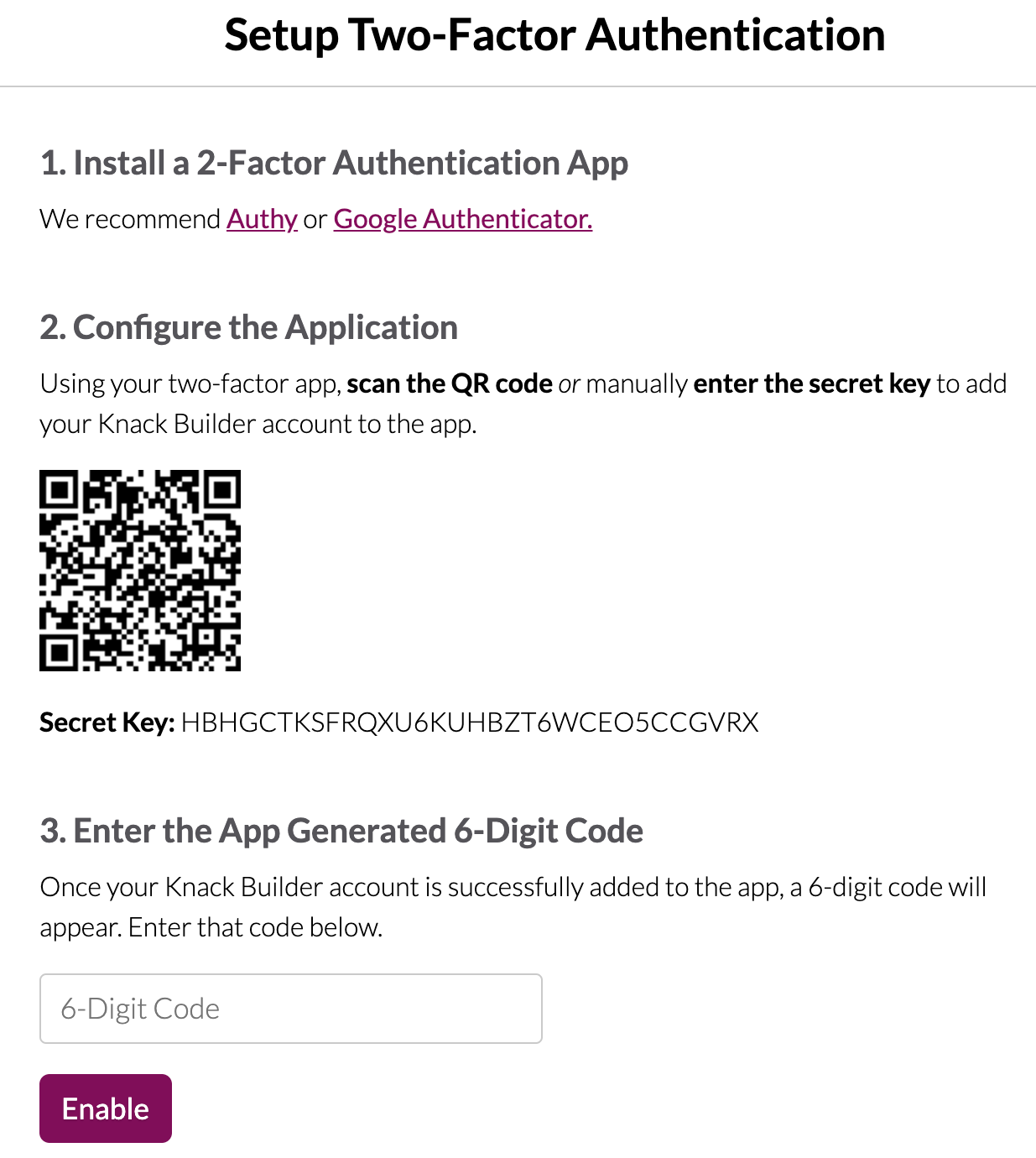 Two-factor authentication can be enabled in the Security section in the Knack Dashboard. Select "Enable 2FA" to get started setting it up.