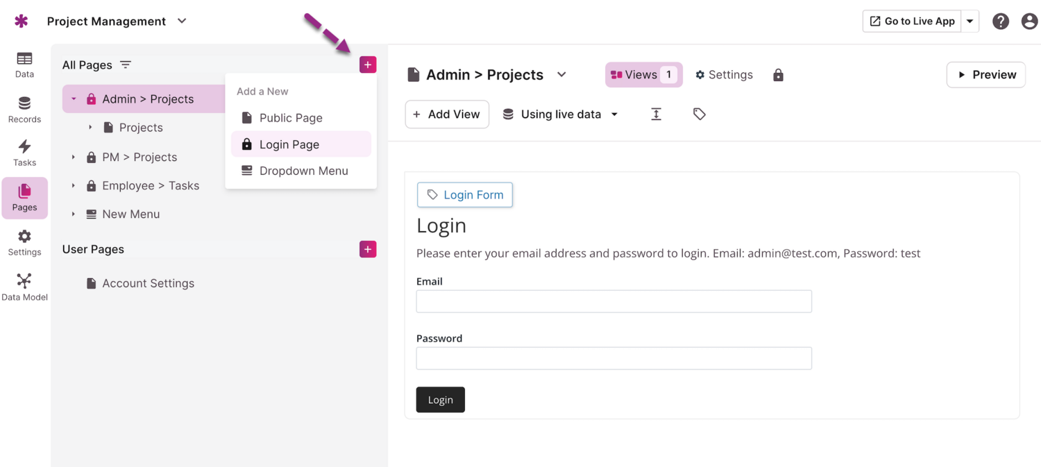 Simply click on the "+" button and choose the "Login Page" option from the dropdown menu.