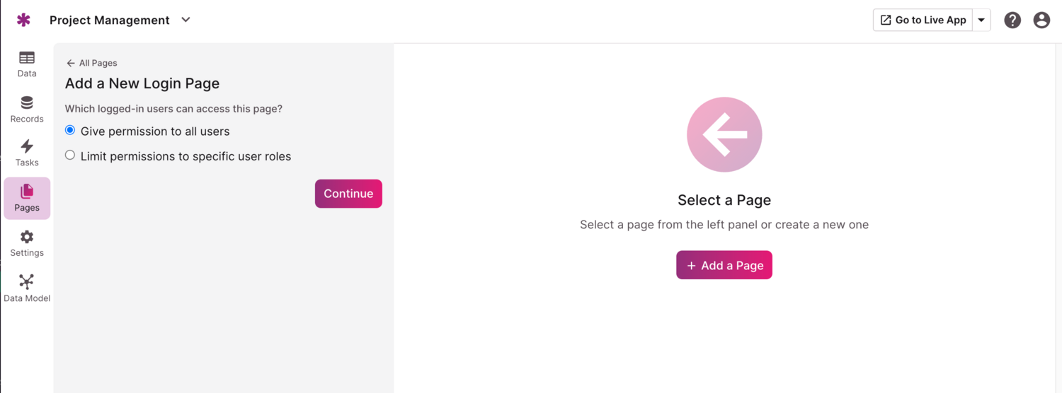 You will be prompted to set up your new page by first specifying which user roles should have access. Simply select the "Give permission to all users" option and select "Continue".
