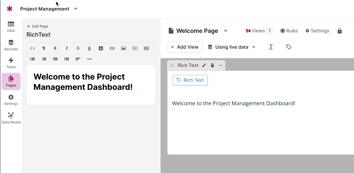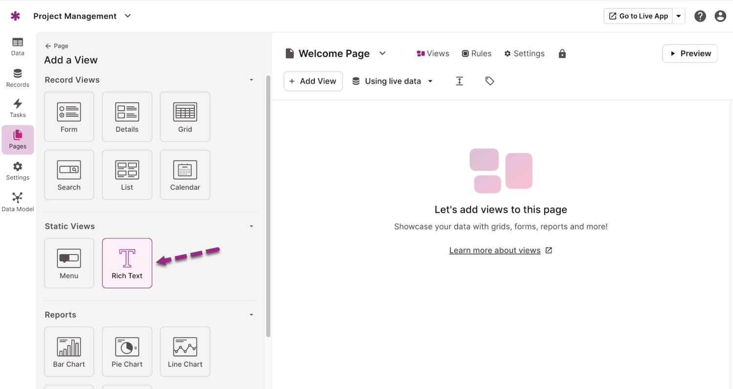 Select the Rich Text view type from the toolbox on the left-hand side.