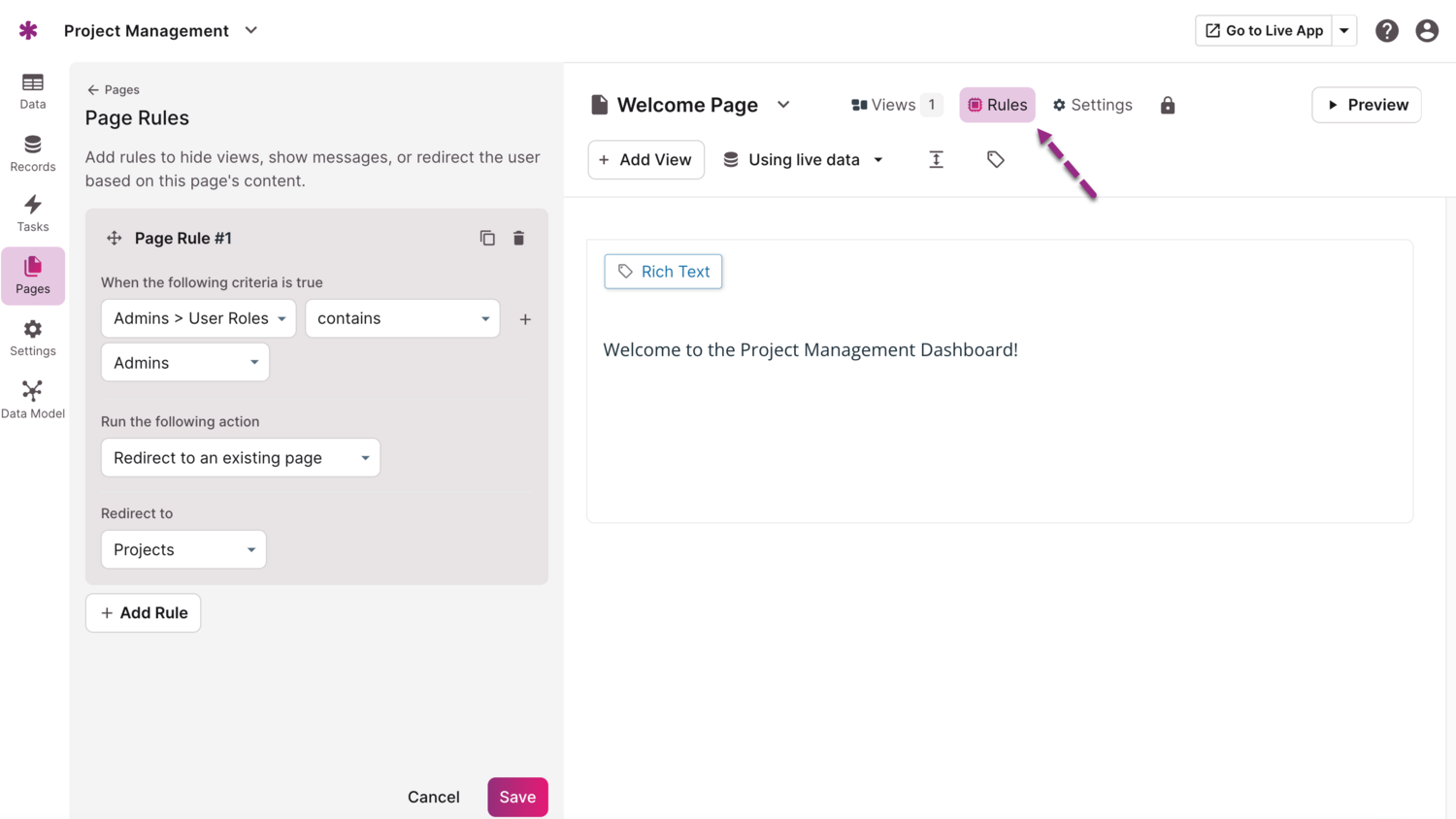 After setting up the user access and providing a name for your page, it's time to enhance your new page with additional views. In this case, we will include a rich text view to showcase a warm welcome message and provide the user with helpful instructions.