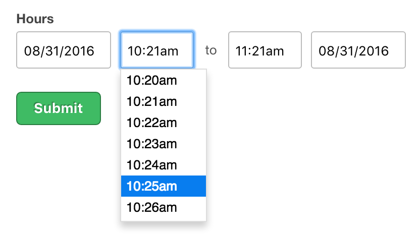 Note: The default Start time is the current date/time, and the default End time is current date/+1 hour. JavaScript code could be used to edit these defaults.