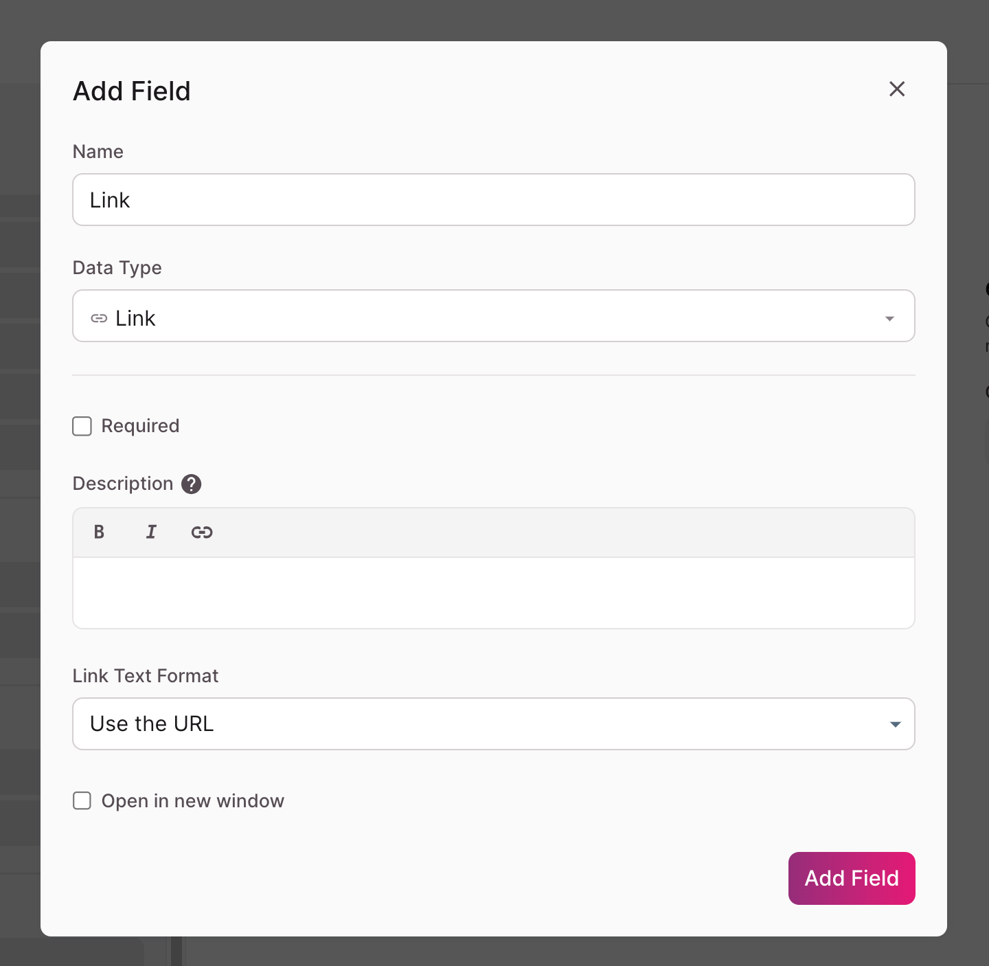 Description: This allows you to input a description for the field. Descriptions will show up as tooltips in record columns and when adding fields.