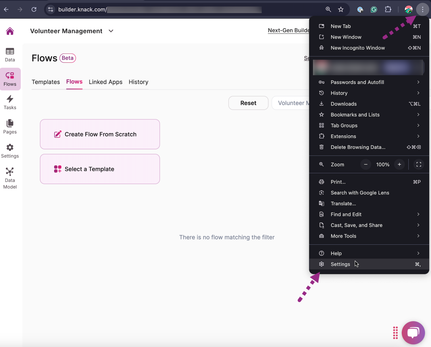 4. Reopen Safari, log into your Knack account, and navigate to your desired Knack app. Once you select Flows from the left-side menu, you should be able to see the Flows interface displayed properly.