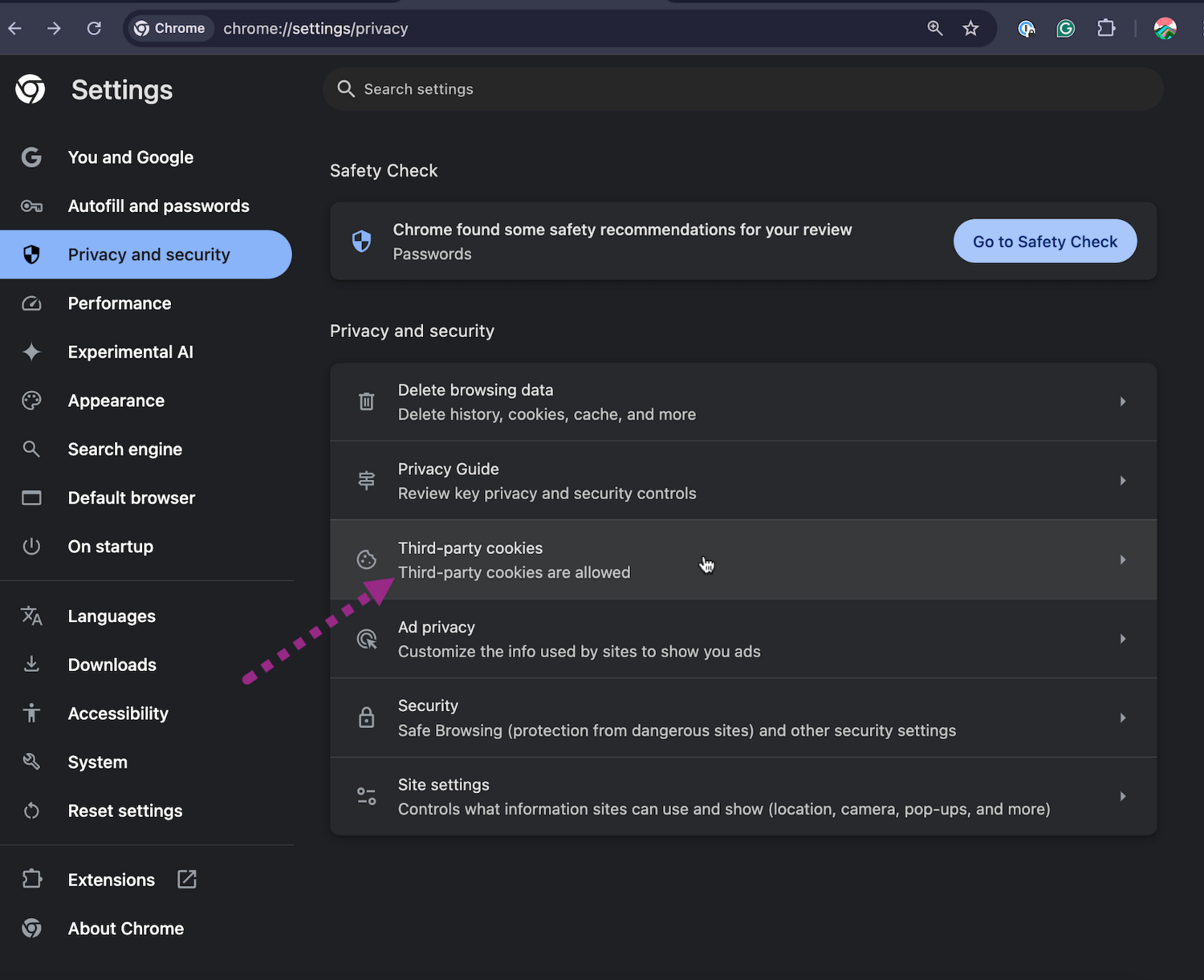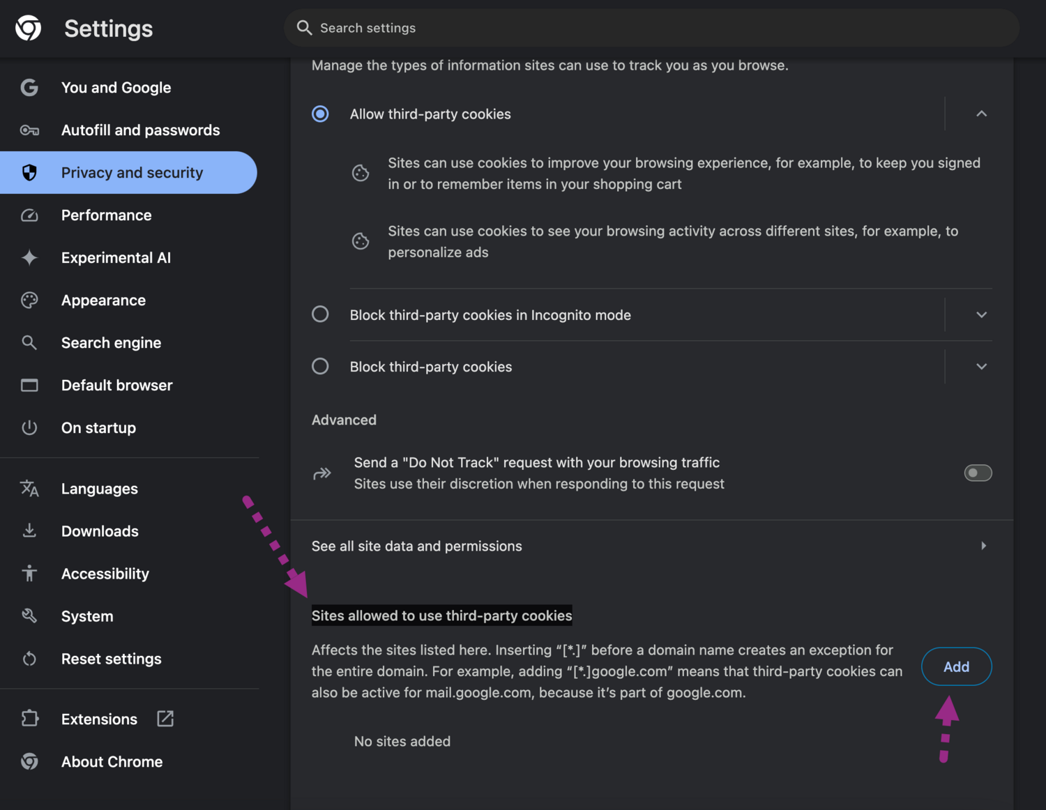 1. Click the three dots (⋮) in Chrome's top-right corner and select "Settings". 2. Select "Privacy and security" from the left menu. 3. Click "Add" next to "Sites allowed to use third-party cookies":