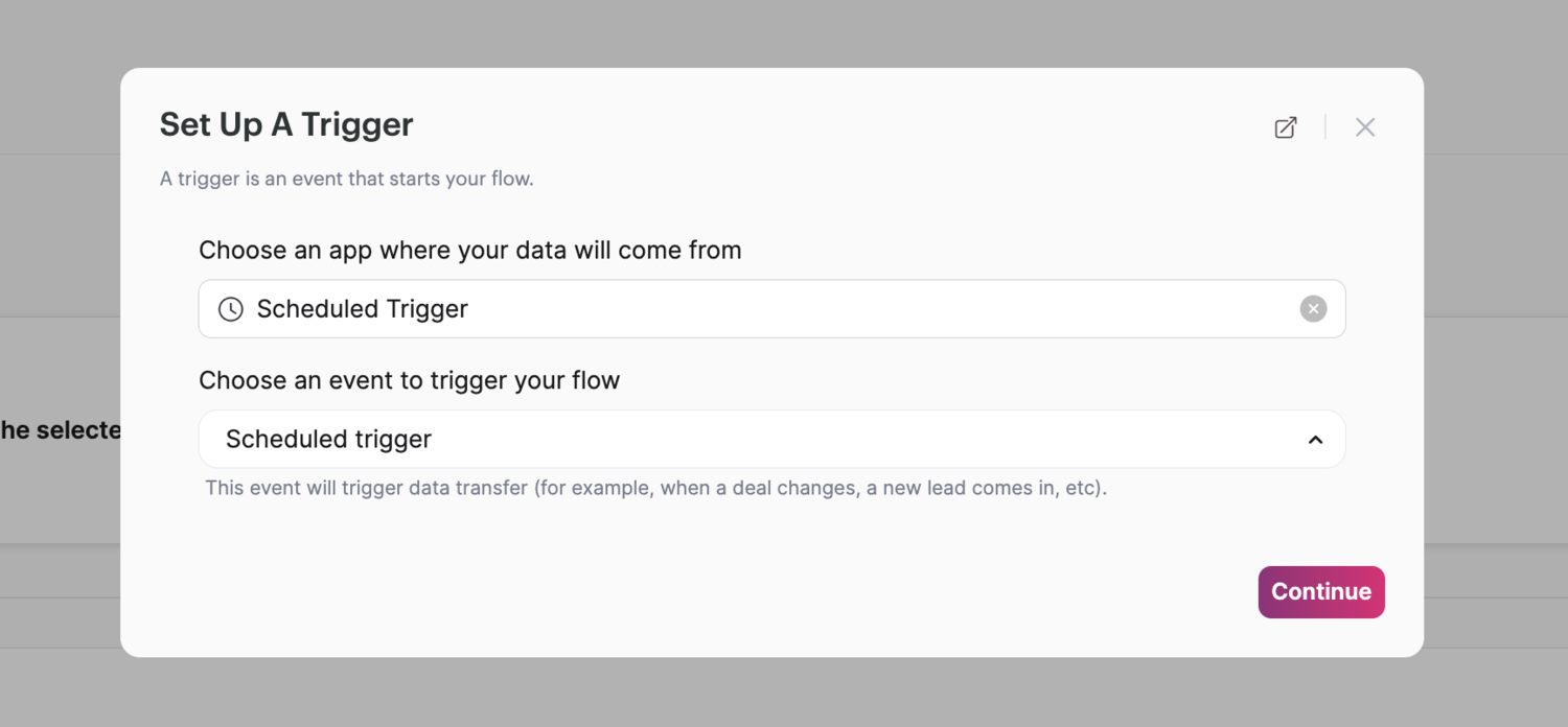To start your flow on a custom schedule, simply search "Scheduled Trigger" in the app/connector dropdown in the first step of your flow