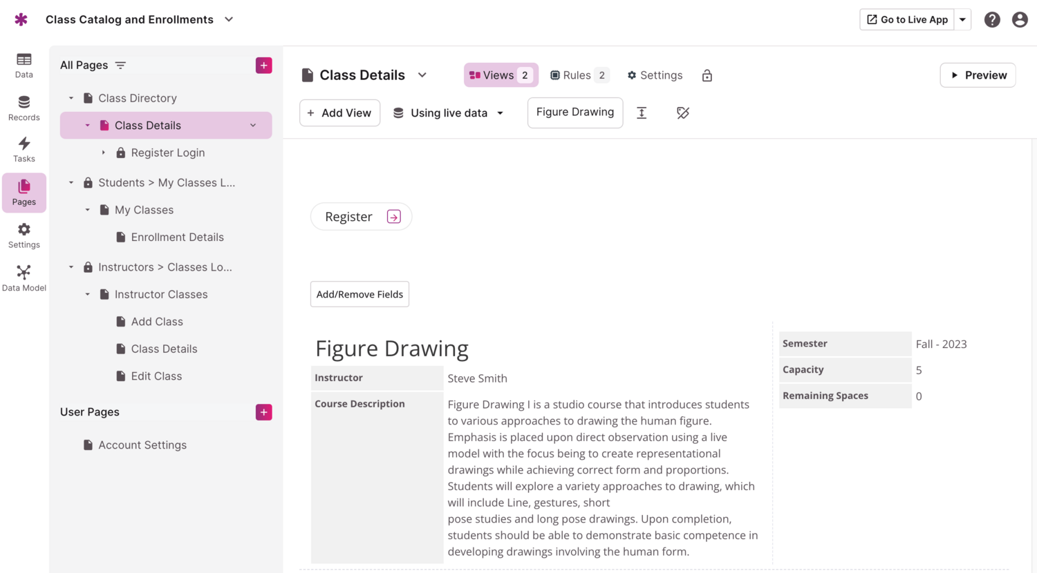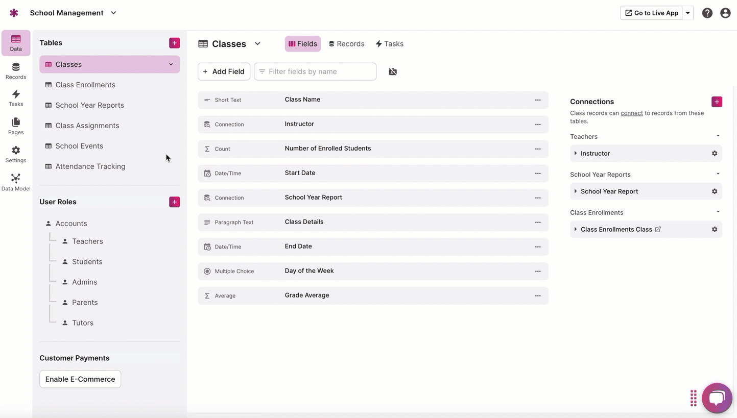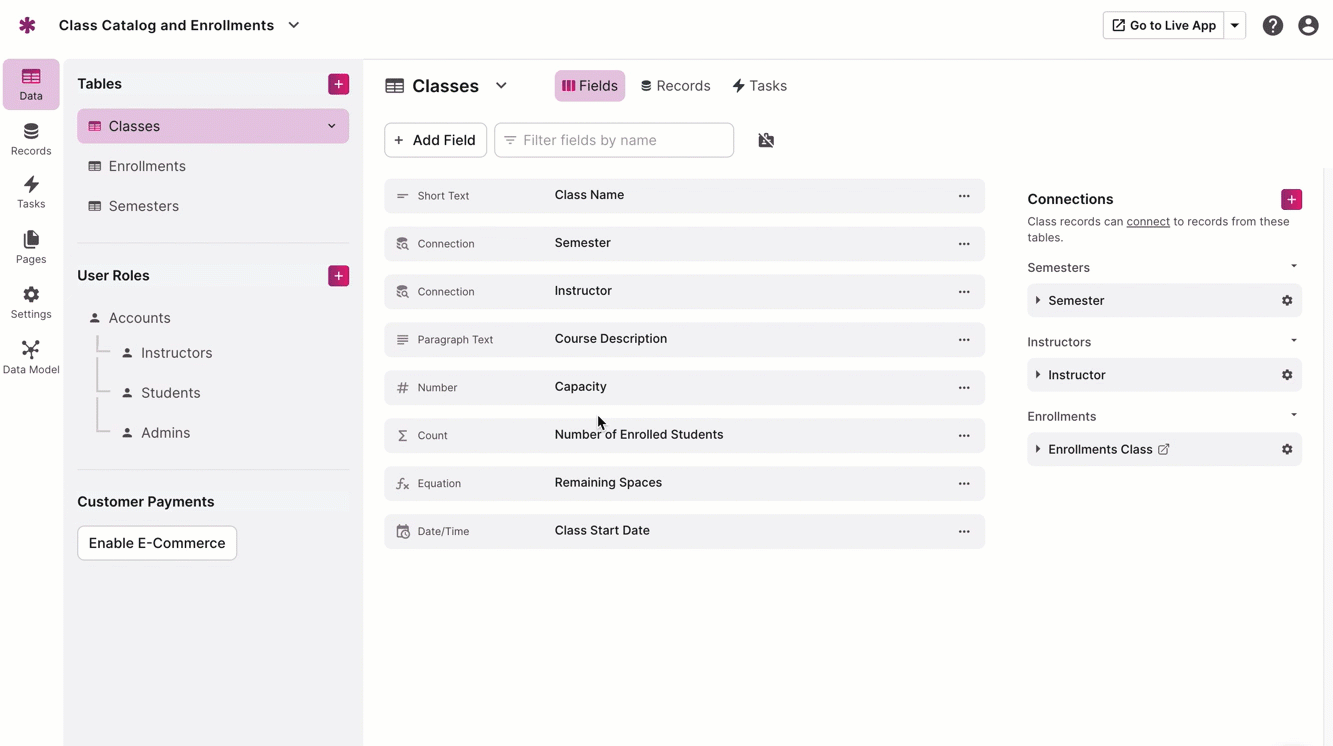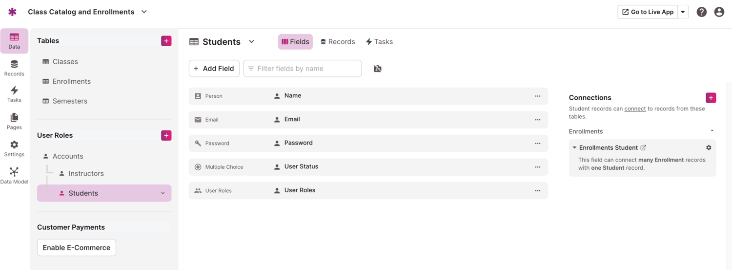 For instance, you might have a Courses table that will contain records on every course your institution provides. You may want to link your Students user role table to connect students with the courses they are enrolled in.