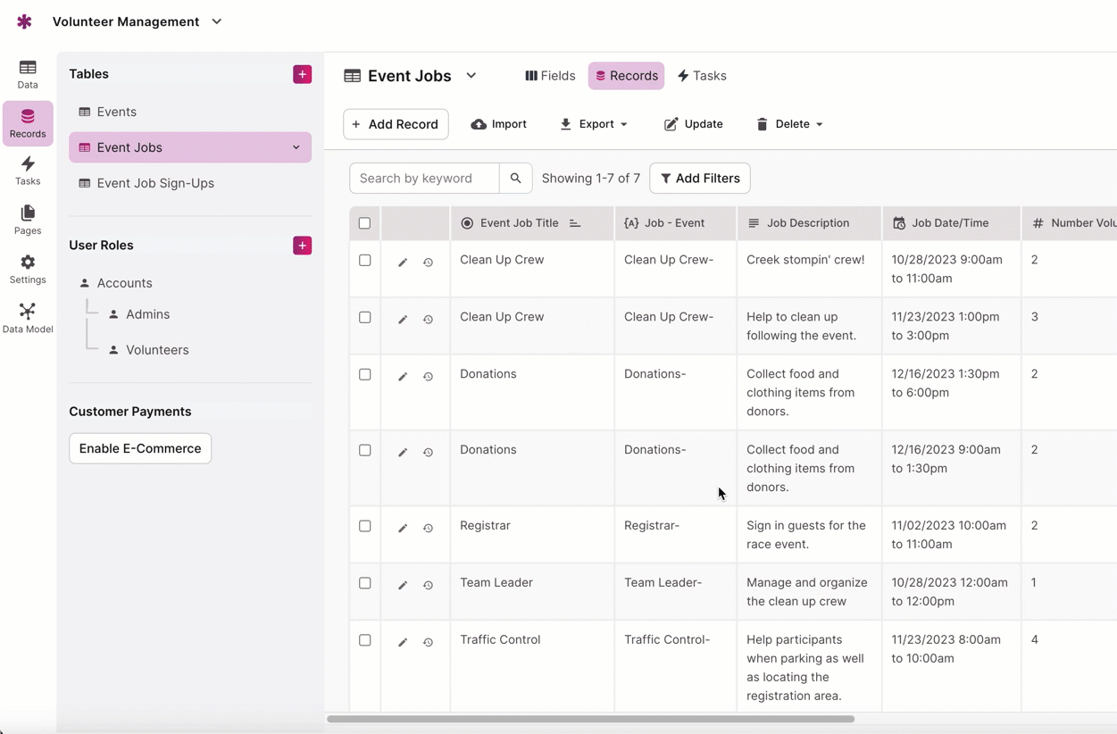 To bulk delete the sample records, head to each table, and in the Records view, select "Delete" and then "Delete All Records":