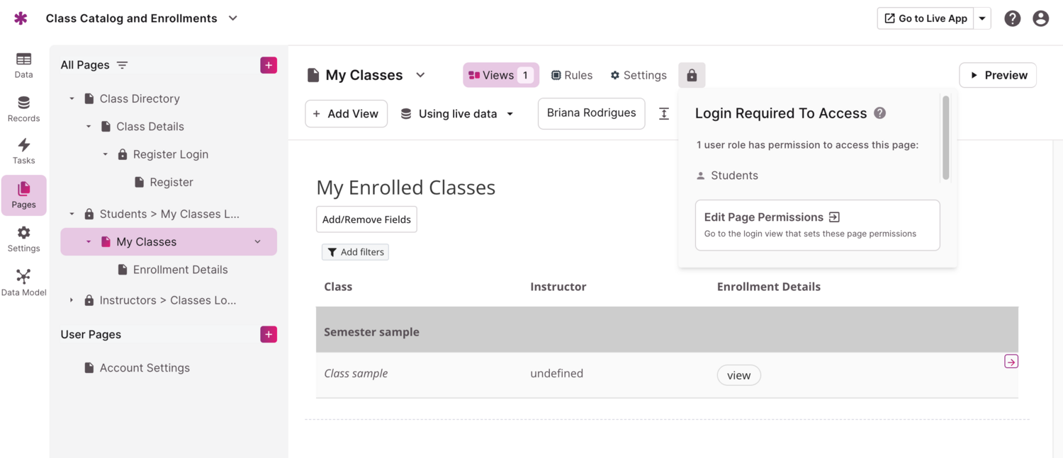 You might want to create pages that require users to sign in before accessing the data, while also having some of your pages public to be viewable for all users. Additionally, it could be beneficial to have pages accessible only to specific user roles, such as only Admins having access to student grade information on one of your pages.