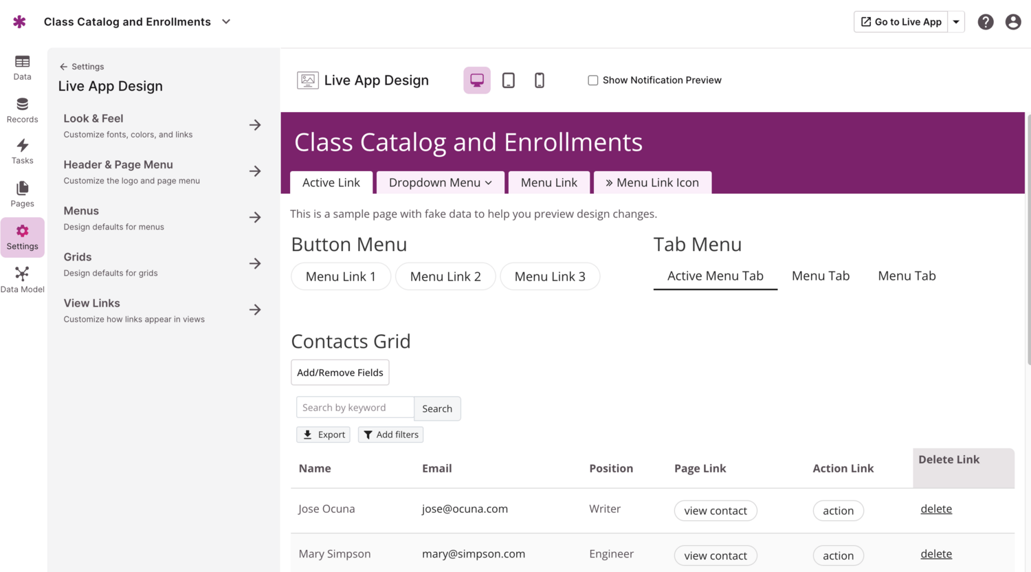 Before sharing your app to your user base, you can add your final touch by customizing the look and feel of your Live App by heading to Settings > Live App Design! This will allow you to make your app personable to your institution's use case and improve your user's app experience.