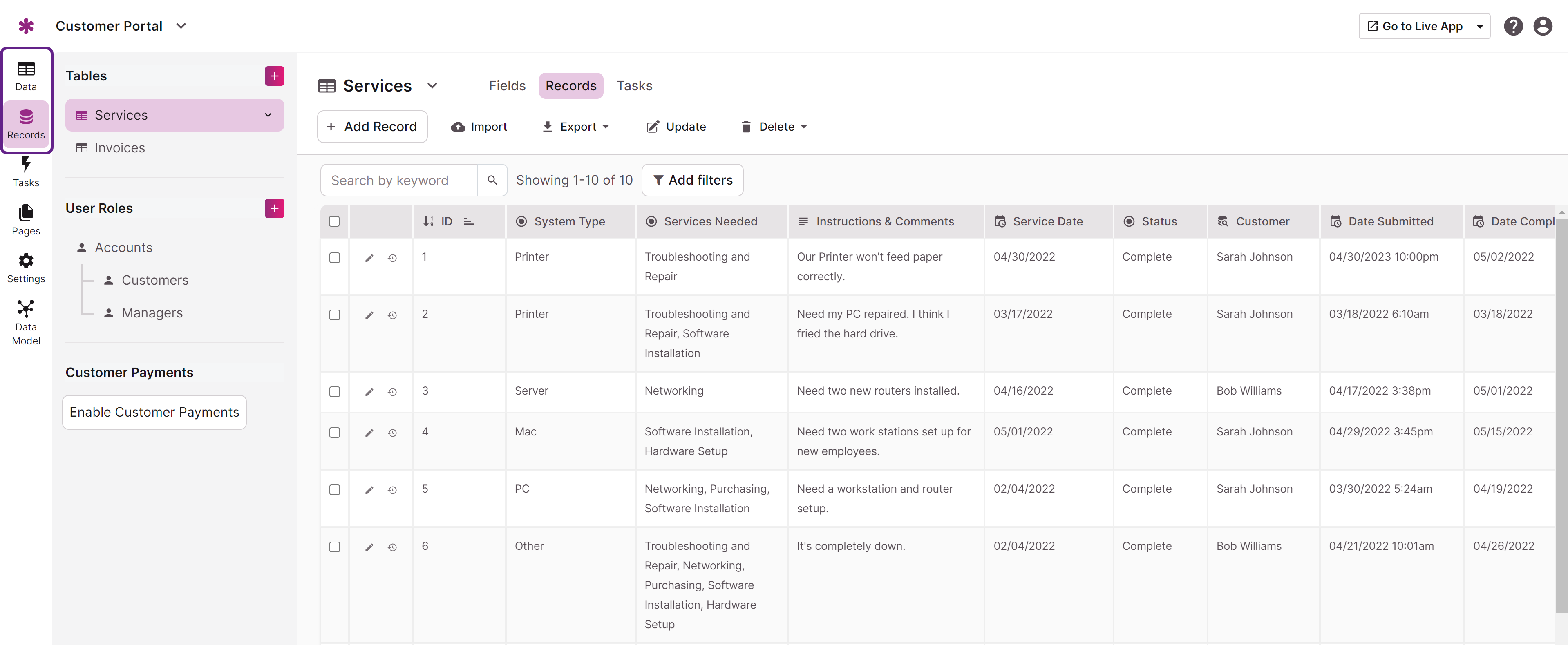 The Builder is where you define what type of data your app will use and how that data will work together. Your app structure and data are managed in the Data and Records section of the Builder.