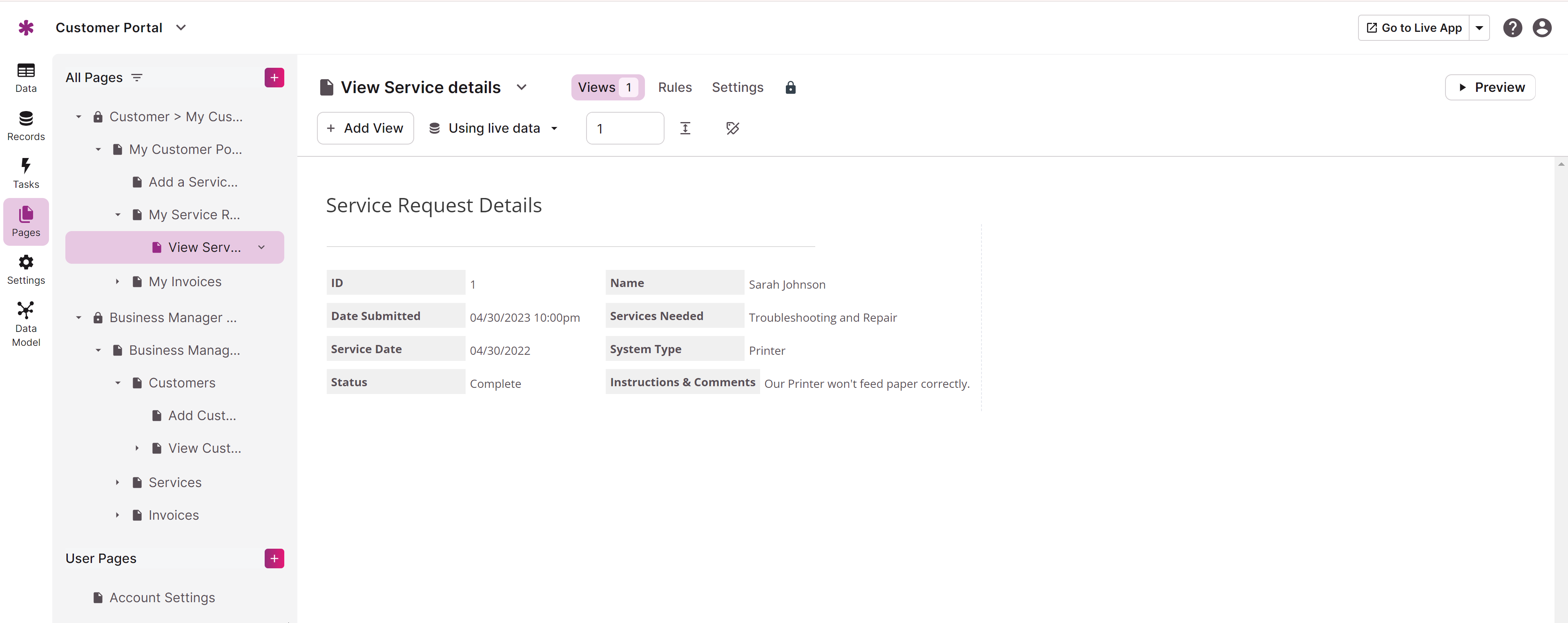Your users will access these pages through the Live App where they can view and update the data that you’ve shared with them.