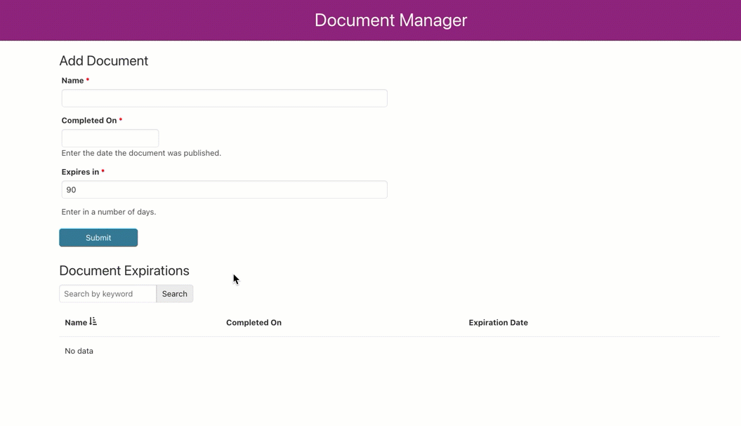For this example, there is a form to submit a document and a grid view below to display the document's details: