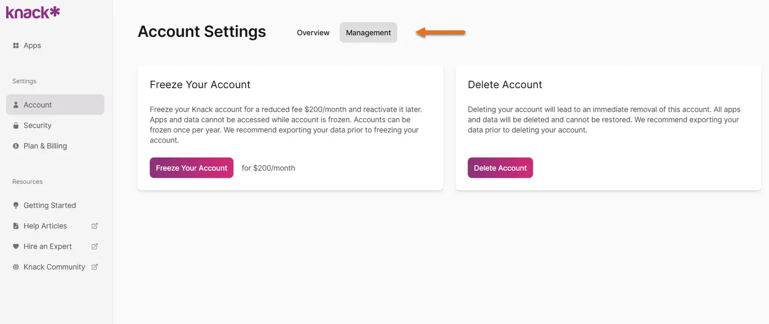 From your Knack Dashboard, select Account. Then, select the Management tab.