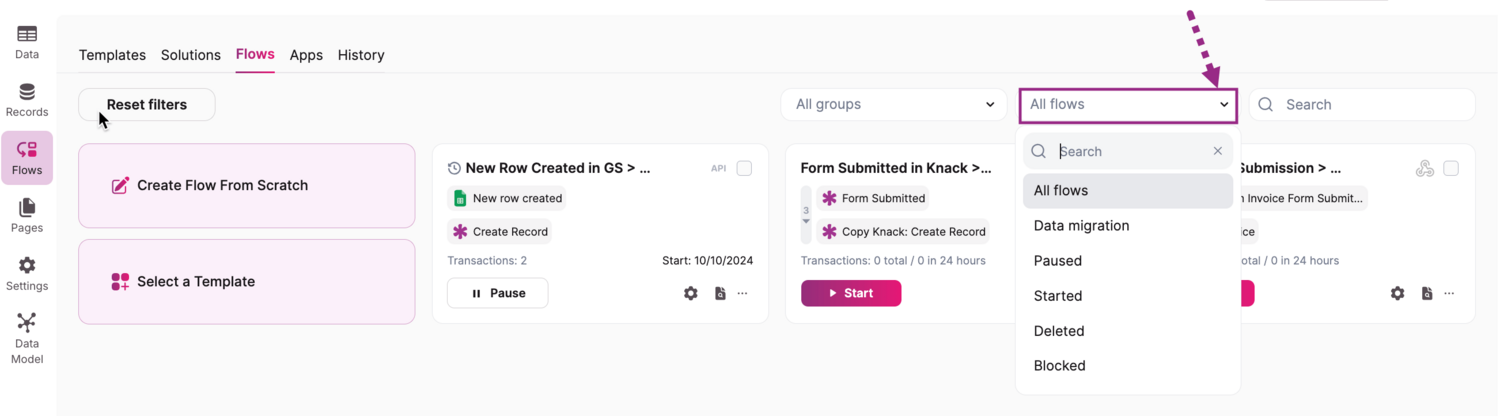 To clear any applied filters/group selections and view all Flows, click the "Reset filters" button to the left of the dropdown list.