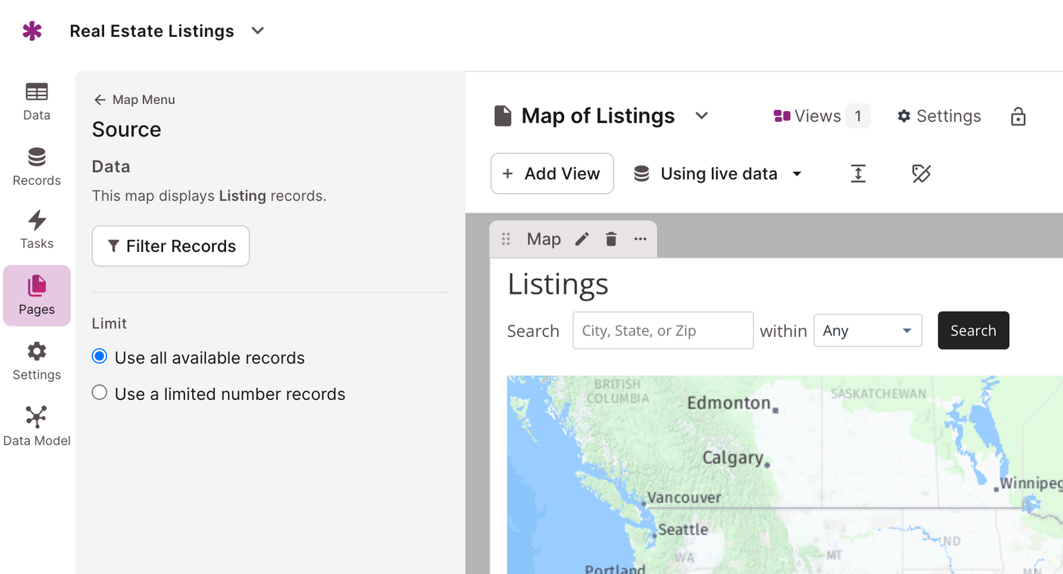 Note: Currently, map views can only show 1,000 records at a time.